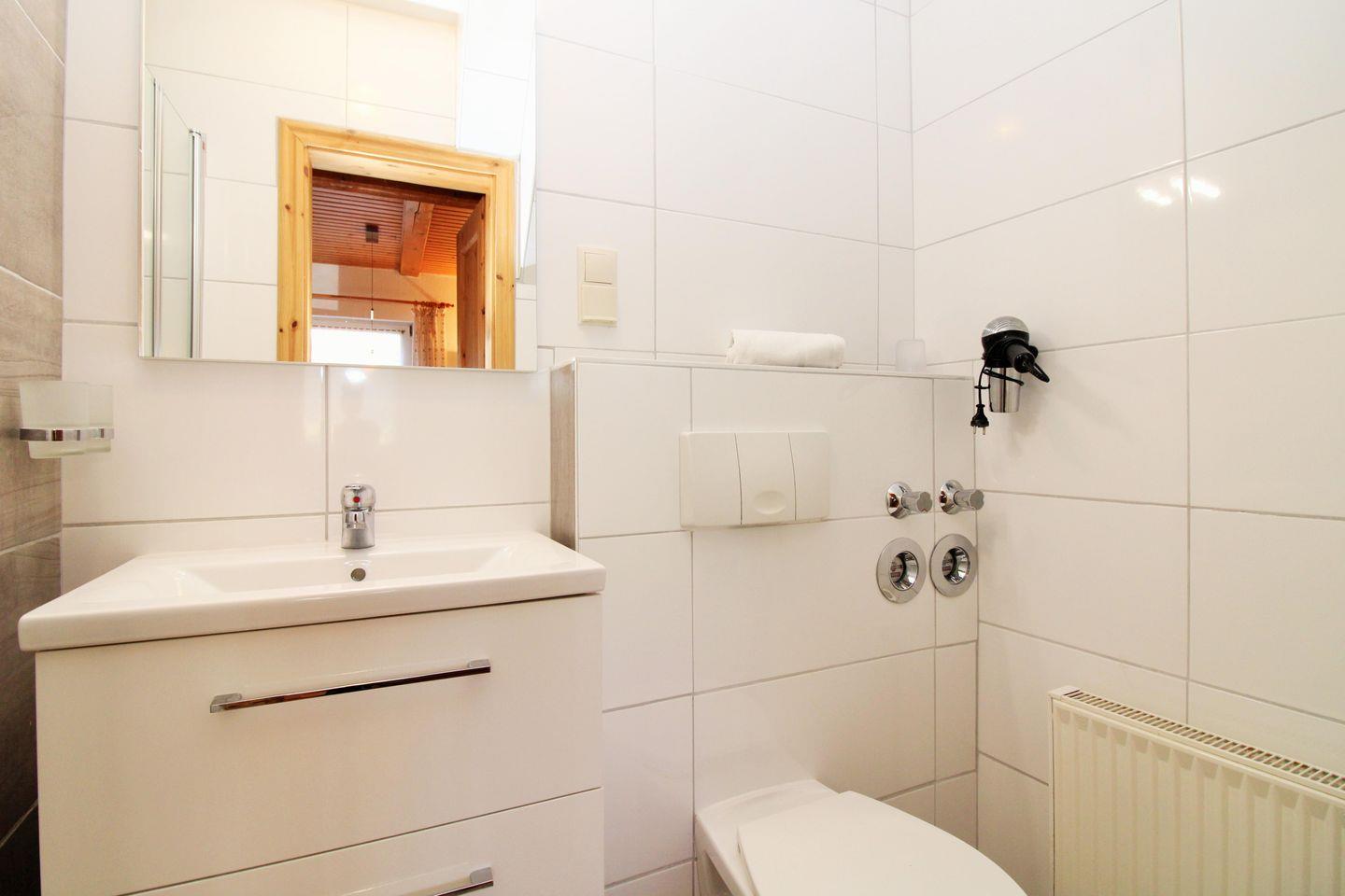 Das moderne Badezimmer verfügt über eine Dusche mit ebenerdigem Einstieg und Echtglas-Duschabtrennung, Waschbecken mit Unterschrank, Föhn sowie WC.
