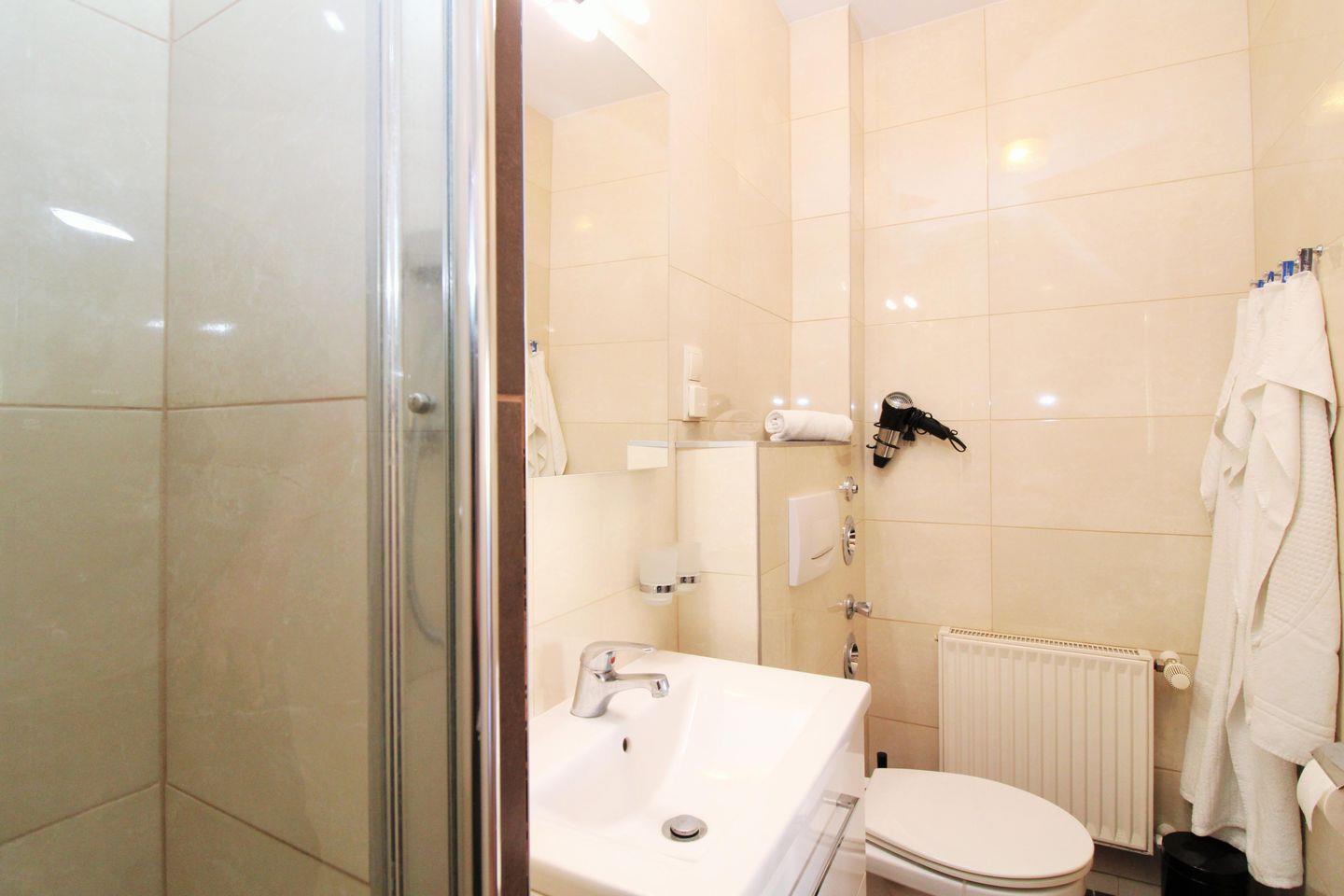 Das moderne Badezimmer verfügt über eine Dusche mit ebenerdigem Einstieg und Echtglas-Duschabtrennung, Waschbecken mit Unterschrank, Föhn sowie WC.