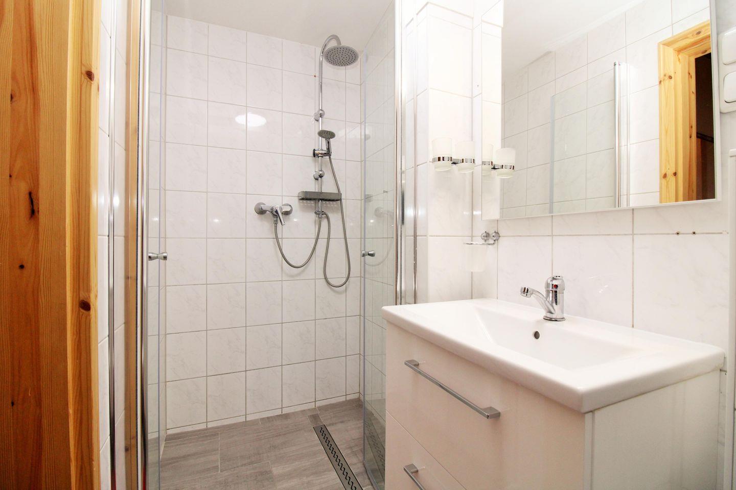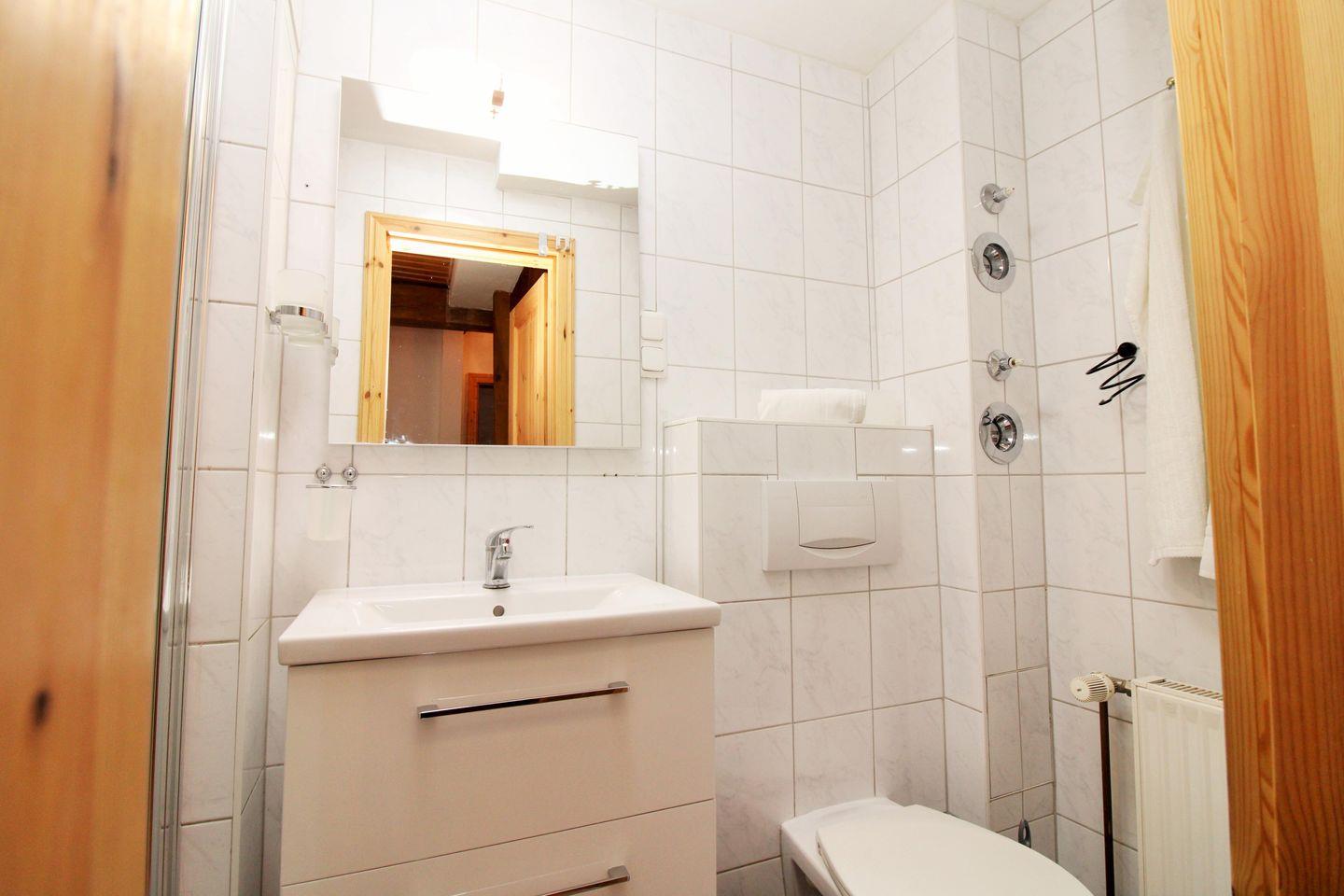 Das moderne Badezimmer (im EG) verfügt über eine Dusche mit ebenerdigem Einstieg und Echtglas-Duschabtrennung, Waschbecken mit Unterschrank, Föhn sowie WC.