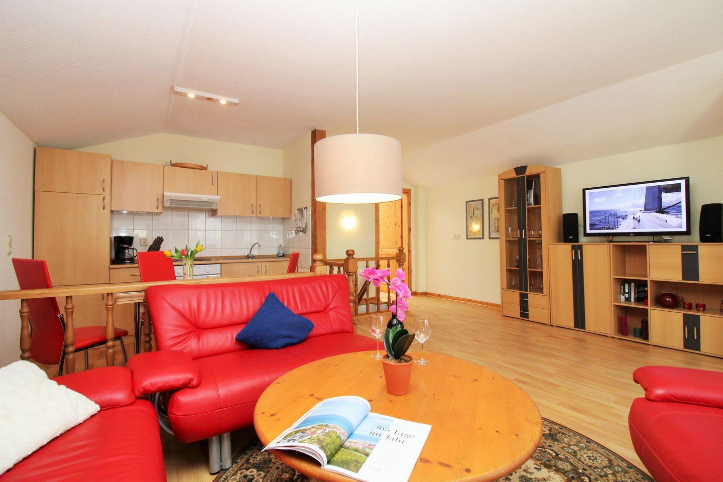 Die strandnahe und geräumige 3-Zimmer-Wohnung (ca. 68 m²) im Erdgeschoss und 1. Obergeschoss (mit innen liegender Treppe) besitzt ein hohes Maß an Funktionalität und ist komplett eingerichtet. Der Bodenbelag im Wohnbereich ist Holzlaminat, das Bad / WC sind gefliest.