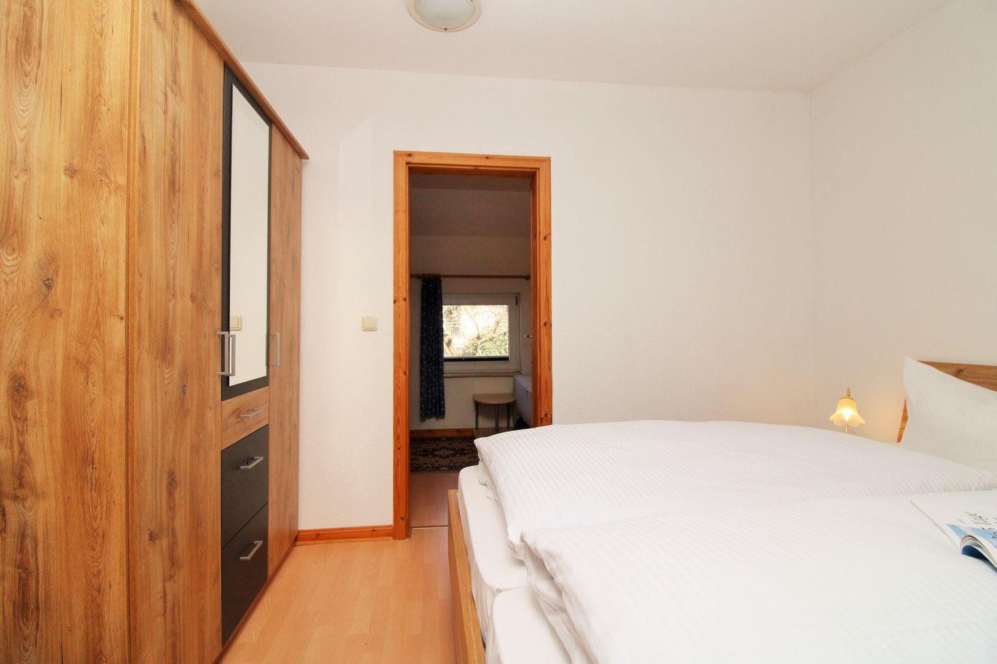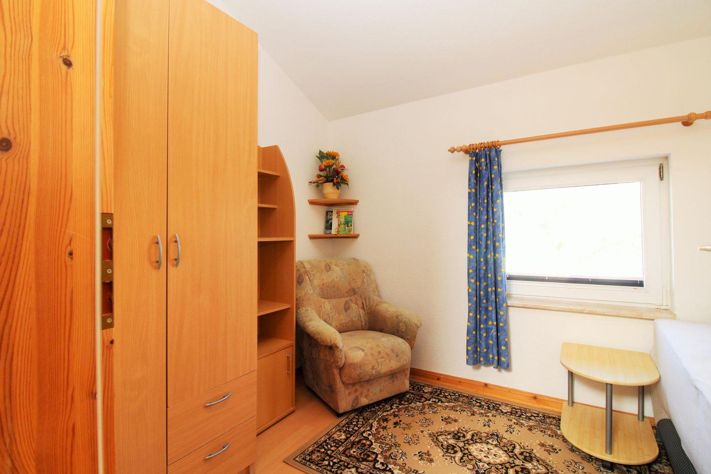 Das separate und zusätzliche 2. Schlafzimmer verfügt über ein bequemes Einzelbett mit Nachttisch und Lampe, einen geräumigen Kleiderschrank, ein Regal sowie einen Sessel.