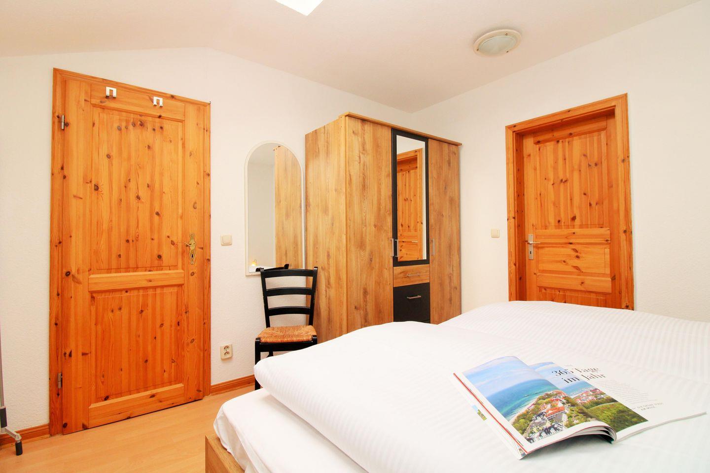 Das gemütliche 1. Schlafzimmer ist mit einem bequemen Doppelbett, Nachttischen mit Lampen sowie einem geräumigen Kleiderschrank eingerichtet.
