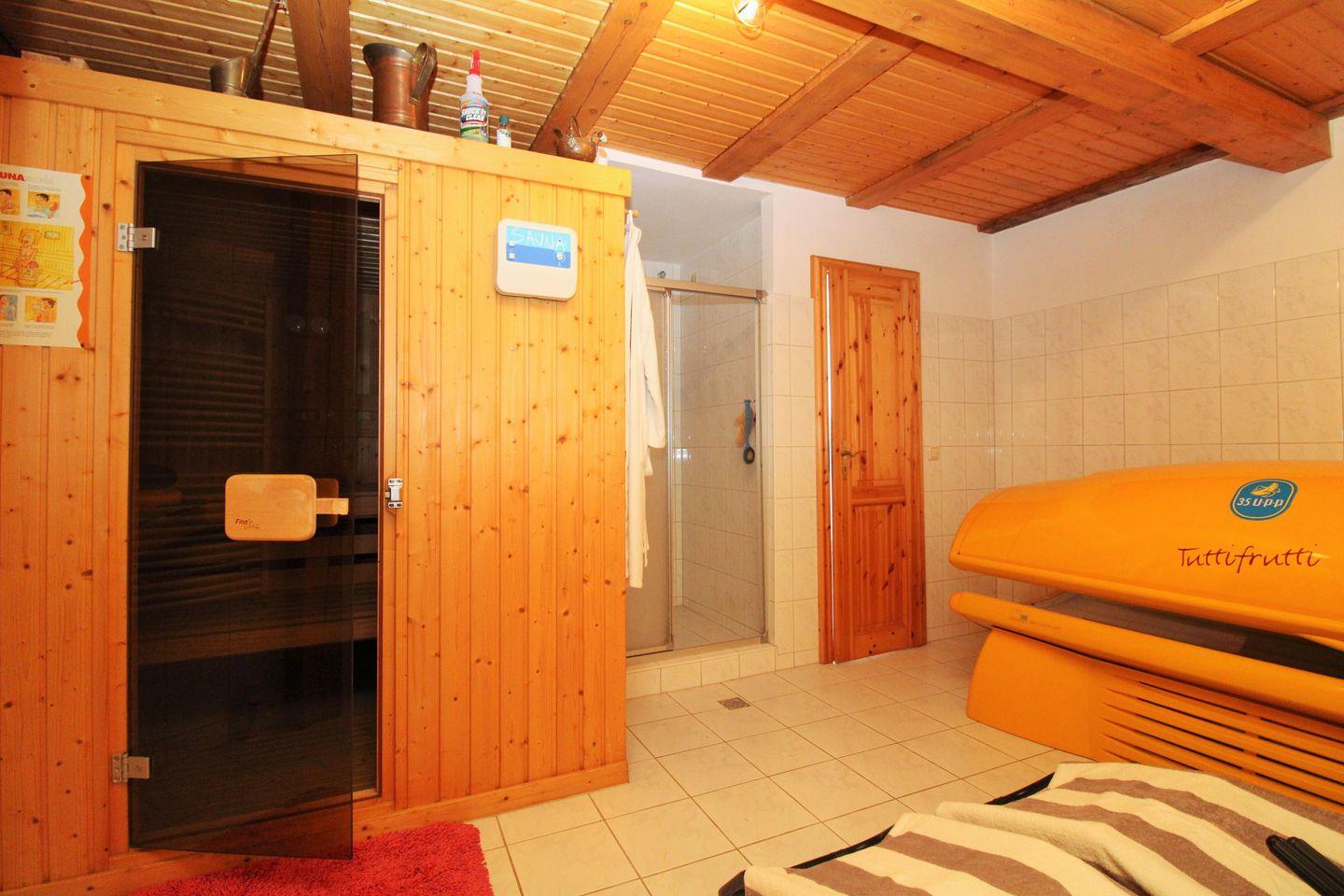 Darüber hinaus steht Ihnen im Erdgeschoss Ihrer Fewo ein Saunabereich mit Ruheliegen und einer Sonnenbank zur Verfügung. Dieser kann auf Wunsch kostenpflichtig (15,00 €) von allen Gästen genutzt werden.