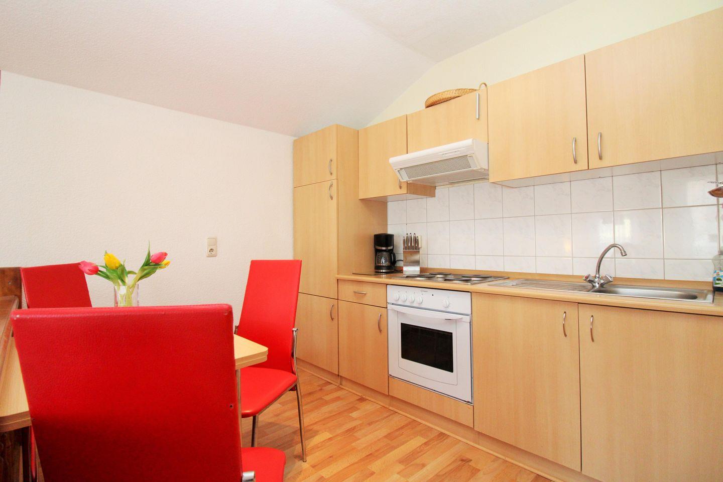 Die offene Küche beinhaltet eine voll ausgestattete Einbauküchenzeile mit 4-Platten-Herd, Backofen, Dunstabzug, Geschirrspüler, Kühlschrank mit Gefrierfach, Kaffeemaschine, Wasserkocher und Toaster. Die Küche ist mit Geschirr, Gläsern, Besteck und Töpfen komplett ausgestattet.