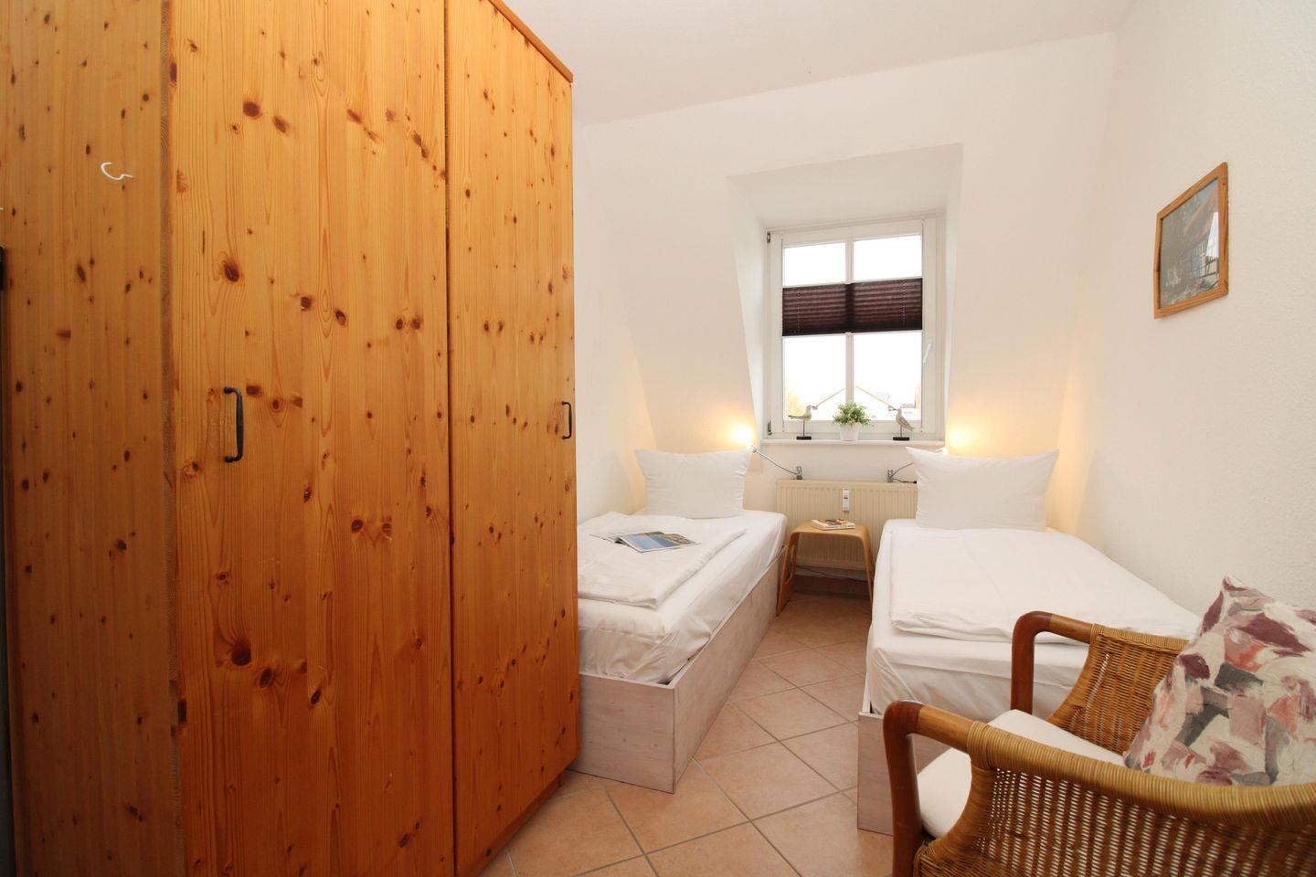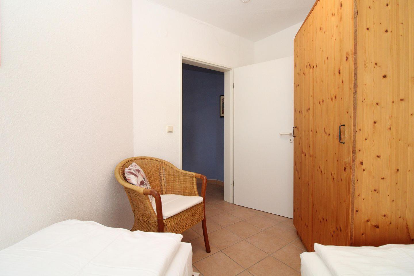 Das Schlafzimmer ist mit 2 bequemen Einzelbetten (2x80x200), einem Nachttisch sowie einem geräumigen Kleiderschrank möbliert. Eine zusätzliche bequeme Schlafmöglichkeit für eine weitere 3. bzw. 4. Person bietet die ausziehbare Schlafcouch im Wohnzimmer.
