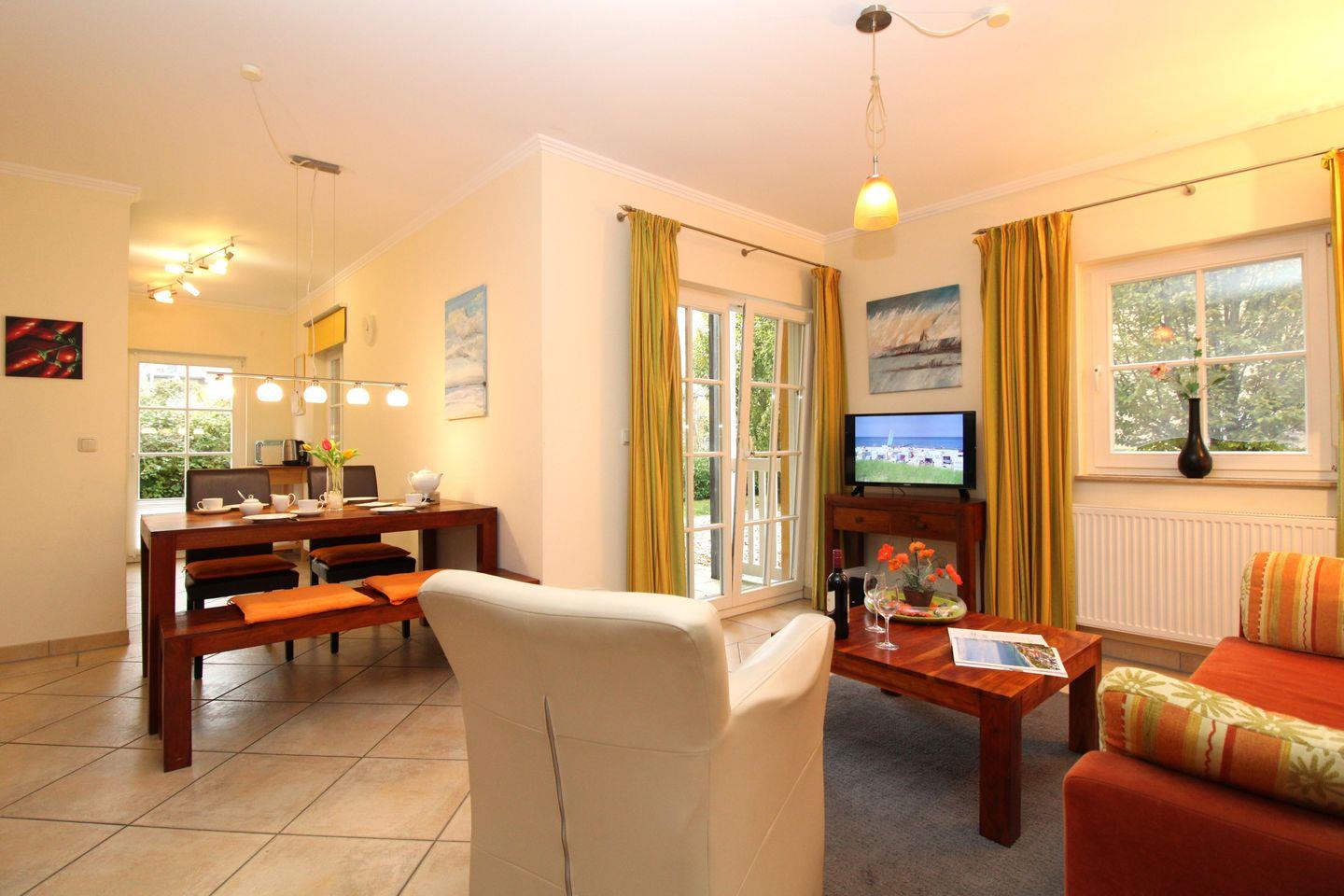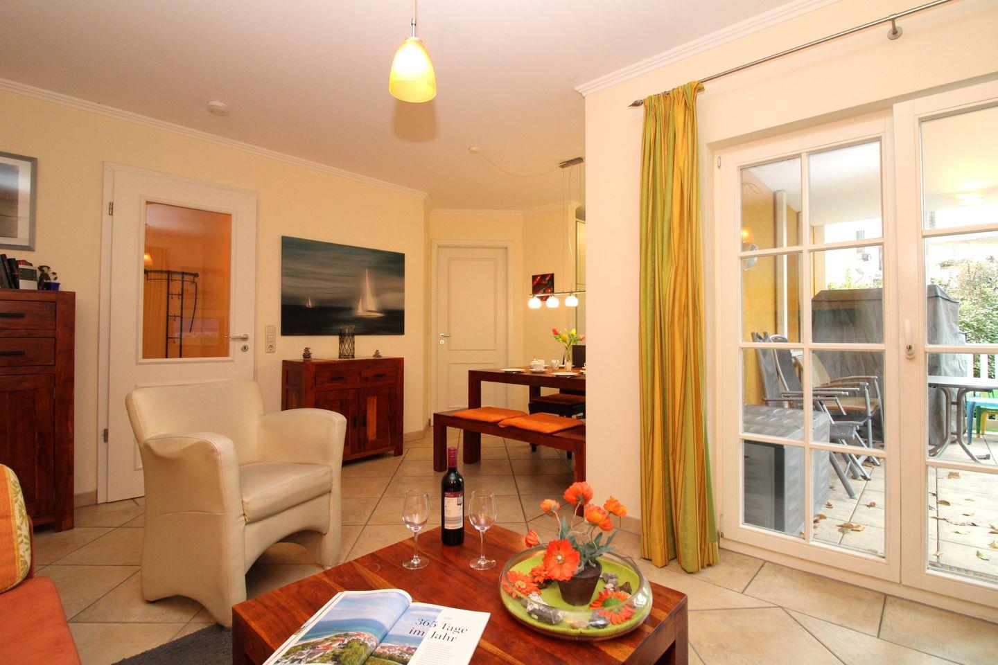 Das helle und freundliche Wohn-/Esszimmer verfügt über eine separate Sitzgruppe mit bequemer (Schlaf-)Couch, Sessel und Couchtisch, einen separaten Esstisch mit einer Sitzbank und Stühlen, ein Sideboard sowie ein Regal. Vom Wohnzimmer aus haben Sie direkten Zugang zu der ca. 10 m² großen und überdachten Sonnenterrasse (nach Süd-Westen ausgerichtet) mit Strandkorb und Gartenmöbeln. Hier sitzen Sie entspannt und gemütlich im Grünen und können abends bei einem guten Glas Wein in Ruhe die lauen Sommernächte genießen!