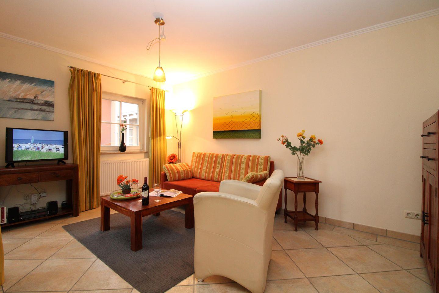 Die strandnahe, helle und komfortable 2-Zimmer-Wohnung (ca. 50 m²) im Erdgeschoss besitzt ein hohes Maß an Funktionalität und ist komplett eingerichtet. Alle Fußböden der Wohnung sind gefliest. Auf Grund der guten Ausstattung wurde die Fewo seitens des Deutschen Tourismusverbandes (DTV) mit einer 4-Sterne****- Auszeichnung zertifiziert.