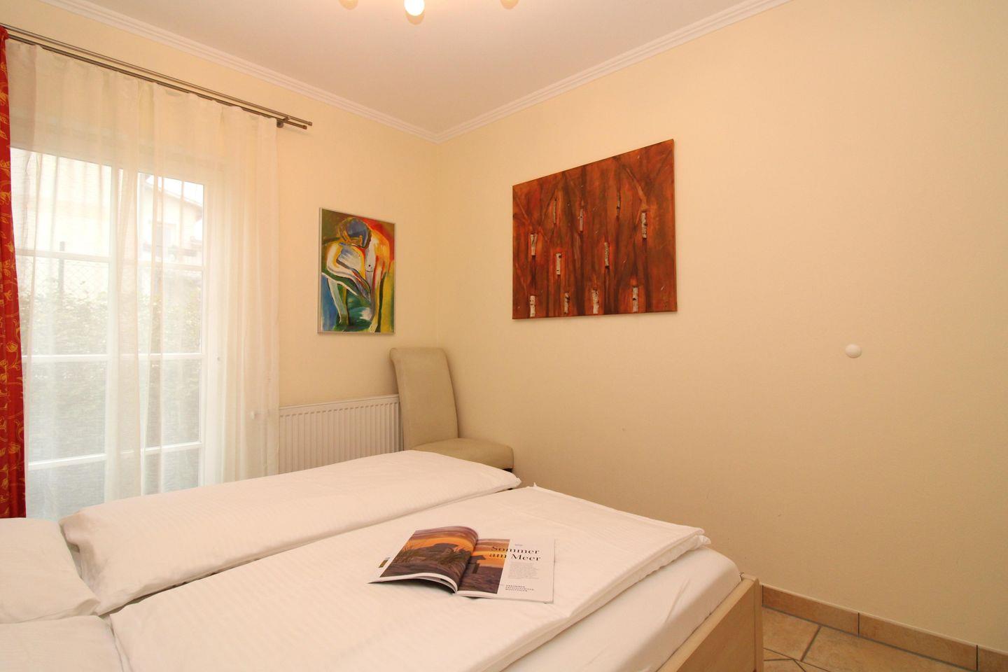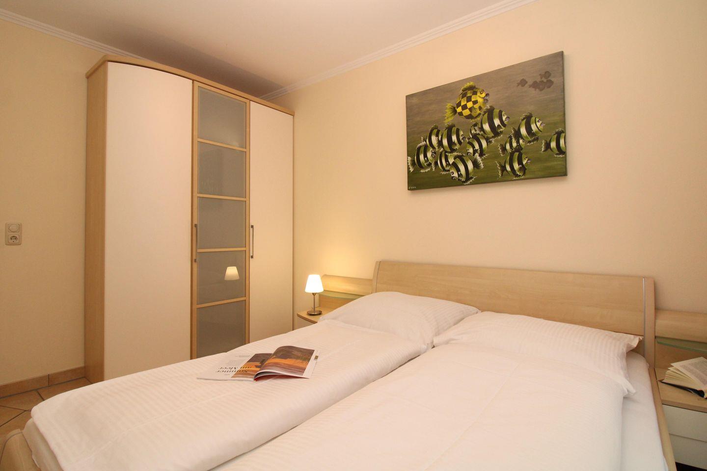 Das gemütliche und geräumige Schlafzimmer ist mit einem bequemen Doppelbett (2x90x200), Nachttischen sowie einem geräumigen Kleiderschrank eingerichtet und verfügt ebenfalls über direkten Zugang zum Garten.