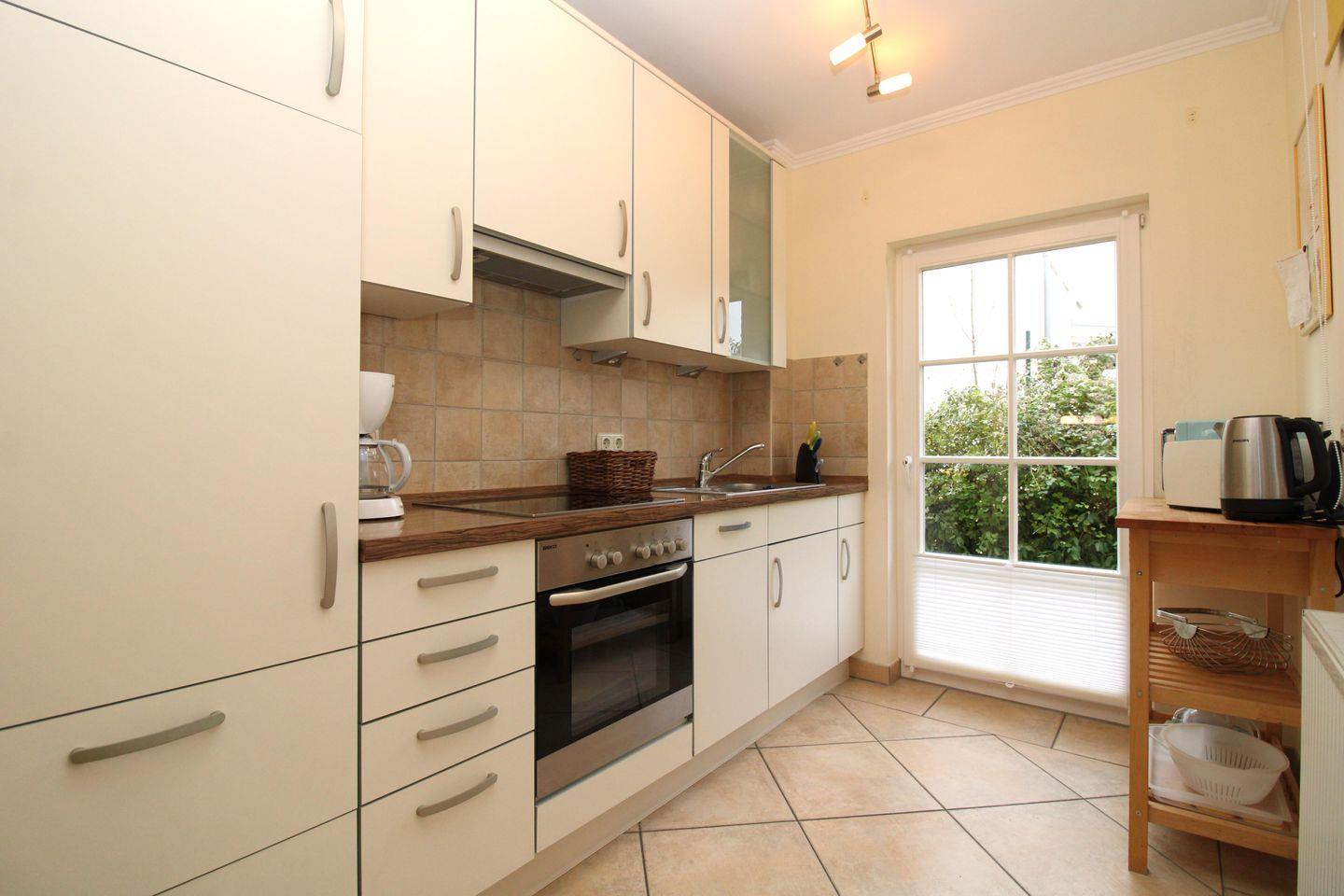 Die offene Küche mit direktem Zugang zum Garten beinhaltet eine voll ausgestattete Einbauküchenzeile mit 4-Zonen-Ceran-Kochfeld, Backofen, Dunstabzug, Mikrowelle, Kühlschrank mit Gefrierfach, Geschirrspülmaschine, Kaffeemaschine, Wasserkocher und Toaster. Die Küche ist mit Geschirr, Gläsern, Besteck und Töpfen bestens und vollständig ausgestattet.