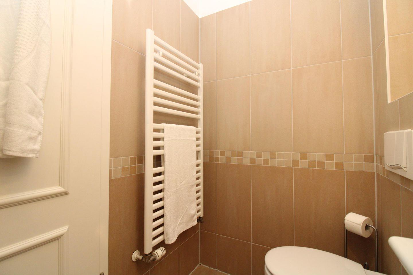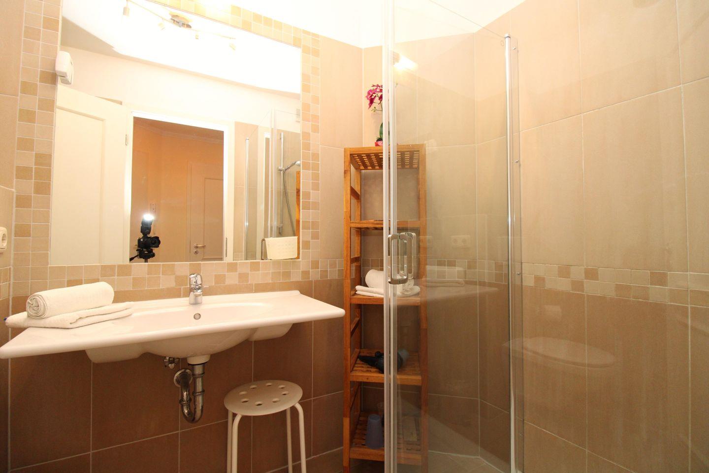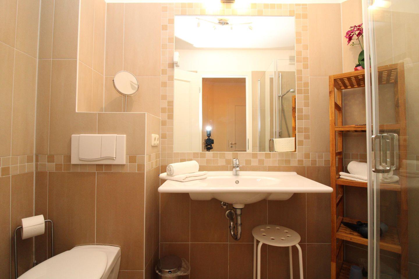 Das Badezimmer verfügt über eine Dusche mit Echtglas-Abtrennung und flachem Einstieg (seniorenfreundlich!), Waschbecken, Kosmetikspiegel, Föhn, Handtuch-Heizkörper, WC sowie ein Regal und ausreichend Ablagemöglichkeiten.