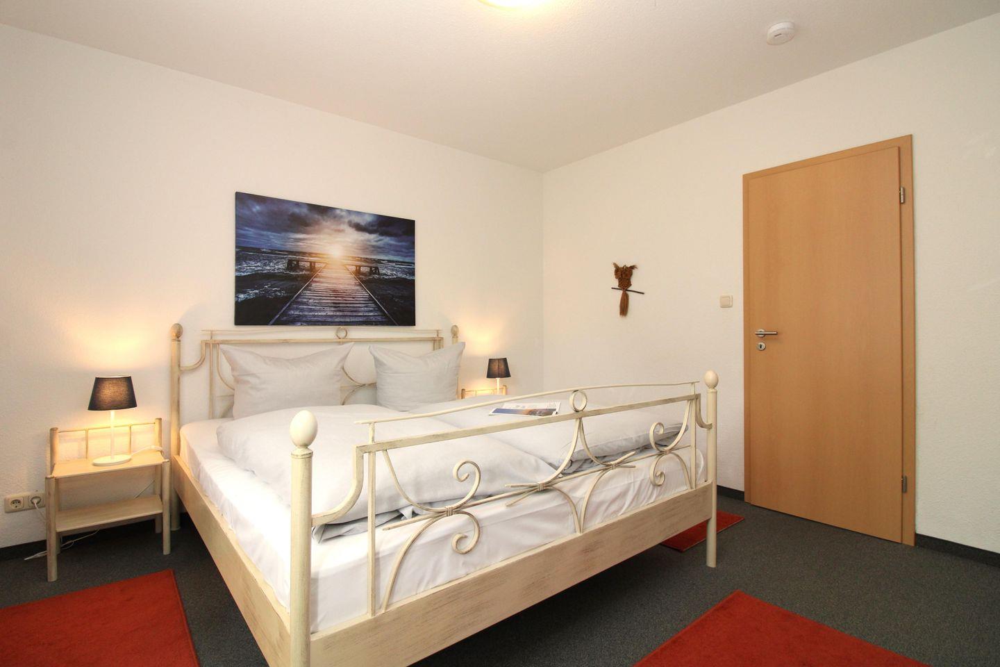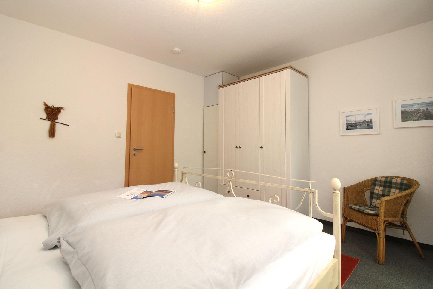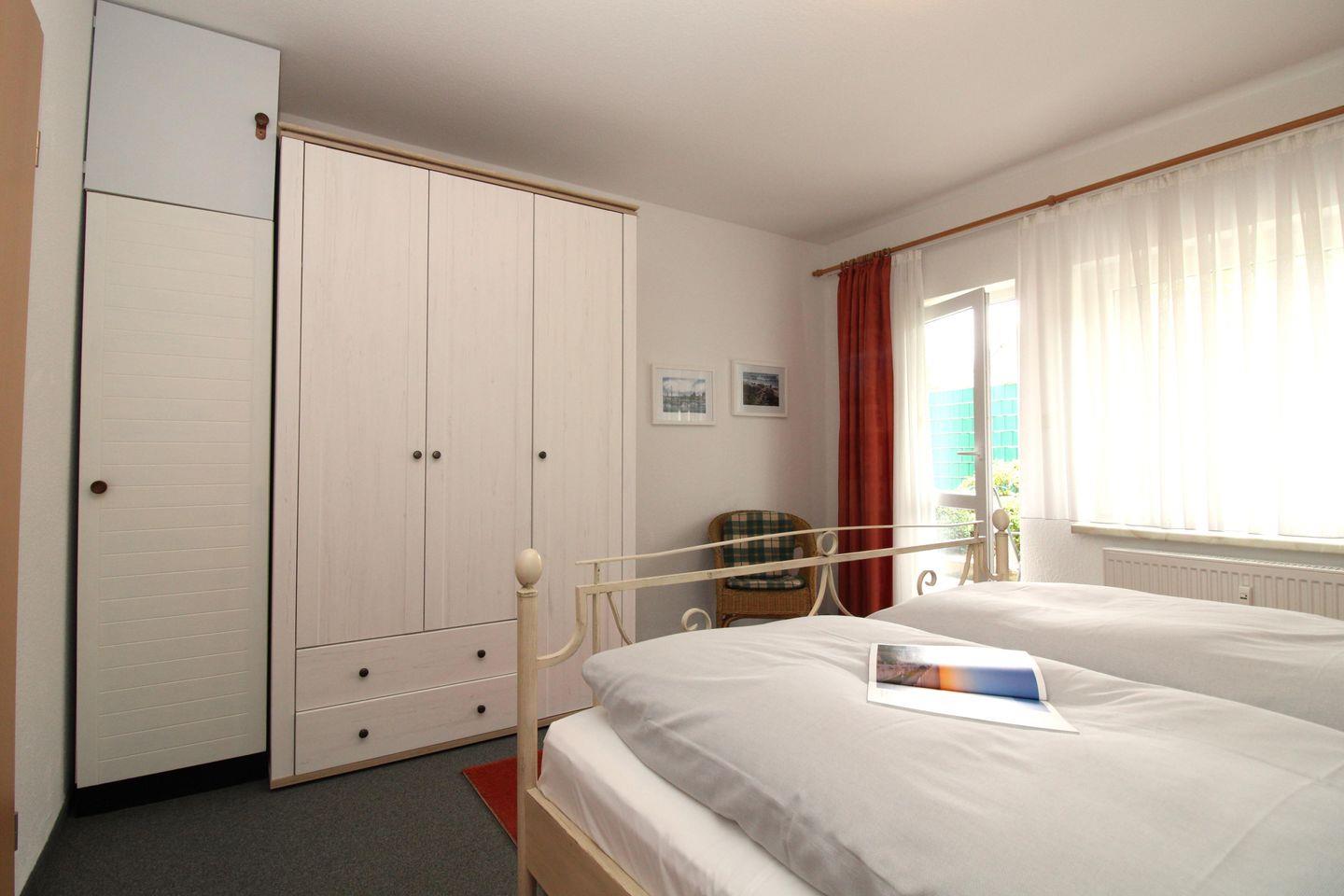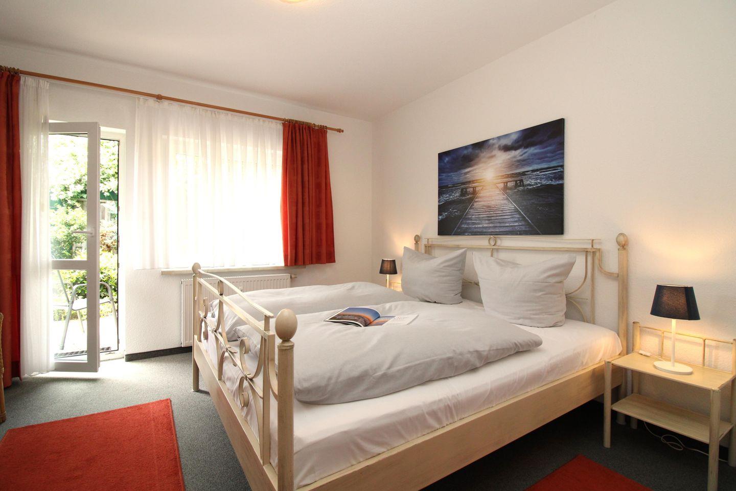 Das freundliche Schlafzimmer ist mit einem bequemen Doppelbett, Nachttischen, einem Korbsessel sowie einem geräumigen Kleiderschrank eingerichtet und hat einen direkten Zugang zur Terrasse. Eine zusätzliche bequeme Schlafmöglichkeit für eine weitere 3. Person bietet die ausziehbare Schlafcouch im Wohnzimmer.