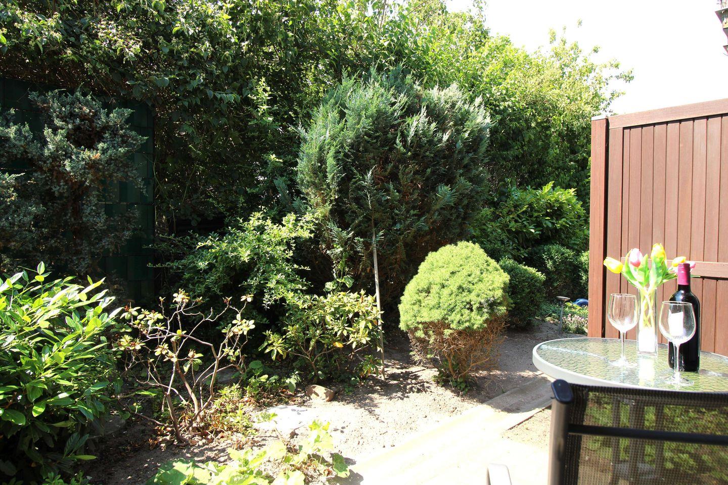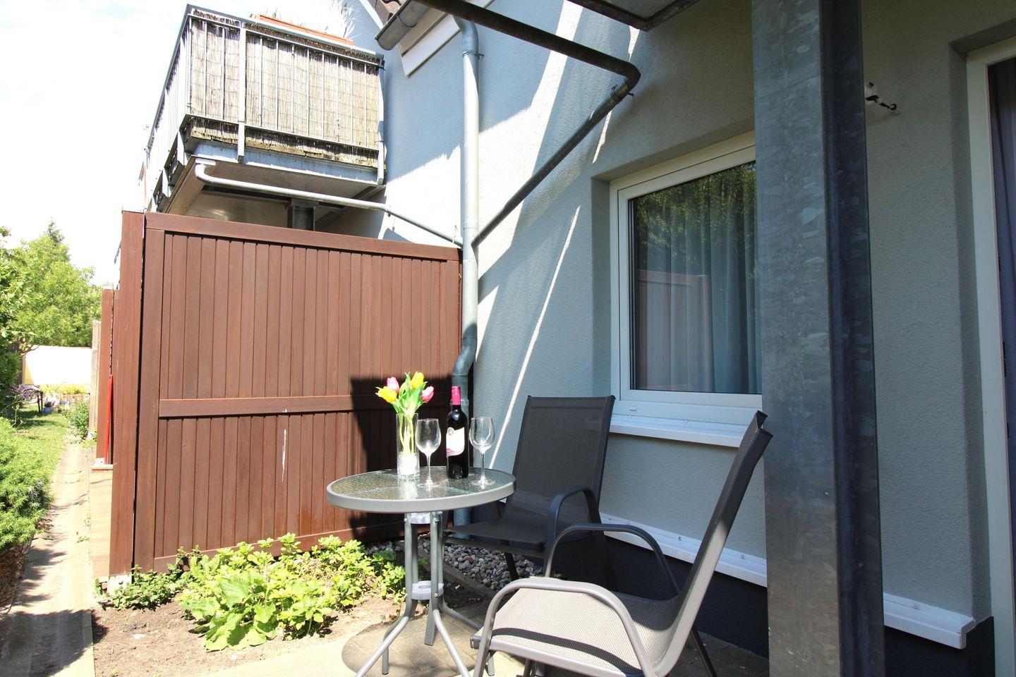 Die Ferienwohnung verfügt über eine ebenerdige, nach Süd-Westen bzw. Westen ausgerichtete, ca. 6 m² große und teilweise überdachte Terrasse (mit Gartenmöbeln), die Sie vom Schlafzimmer aus erreichen. Hier sitzen Sie entspannt und gemütlich im Grünen und können abends bei einem guten Glas Wein in Ruhe die lauen Sommernächte genießen!