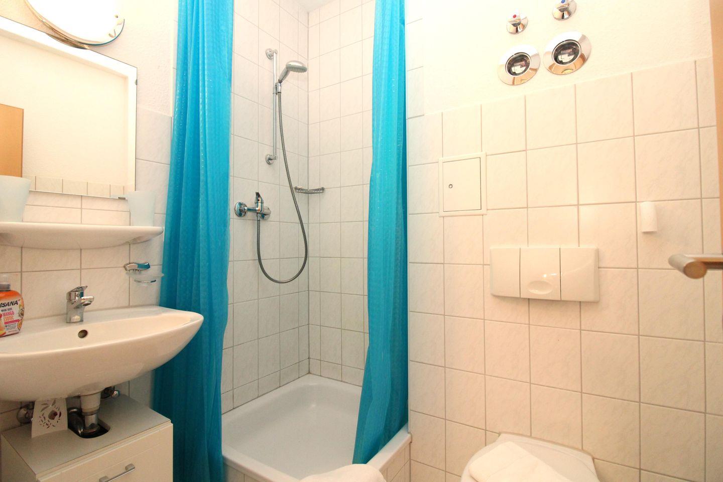 Das Badezimmer verfügt über eine Dusche, Waschbecken und WC, einen Waschtisch-Unterschrank sowie ausreichend Ablagemöglichkeiten.