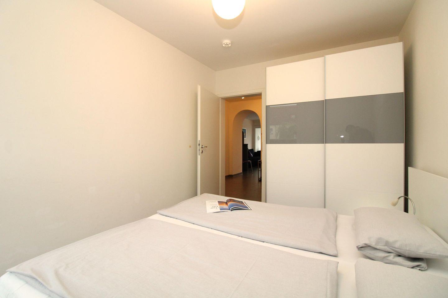 Das helle und moderne 1. Schlafzimmer ist mit einem bequemen Doppelbett (180 x 200), Nachttischen sowie einem geräumigen Kleiderschrank eingerichtet.