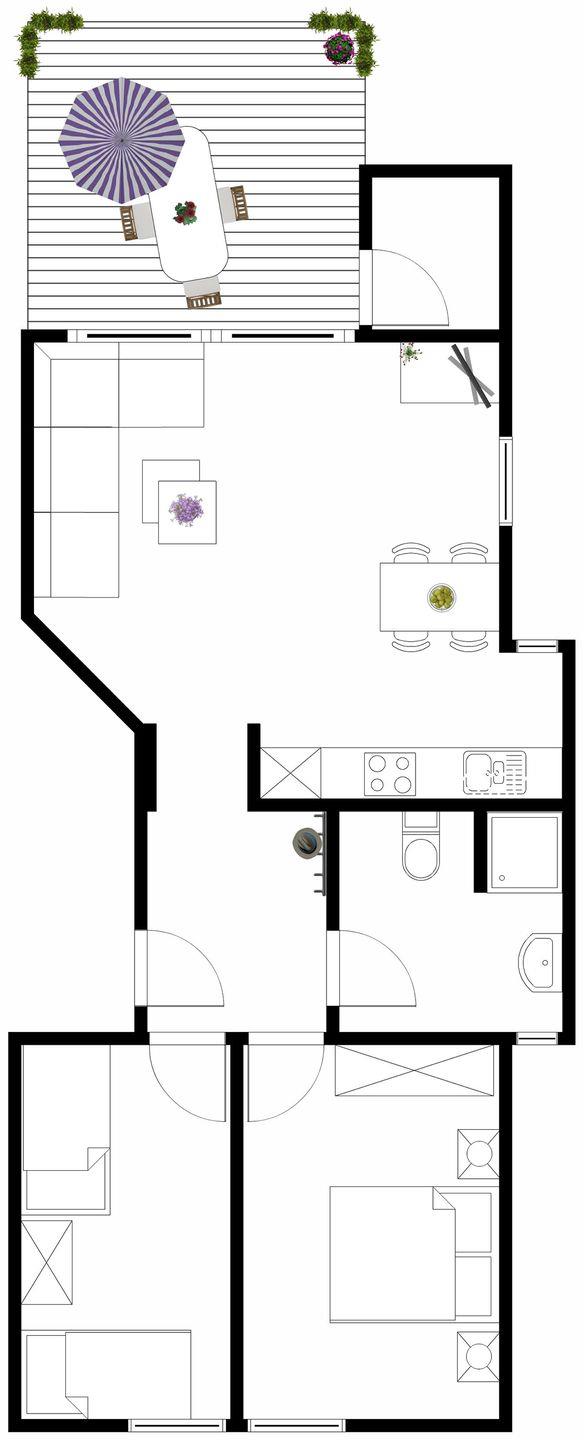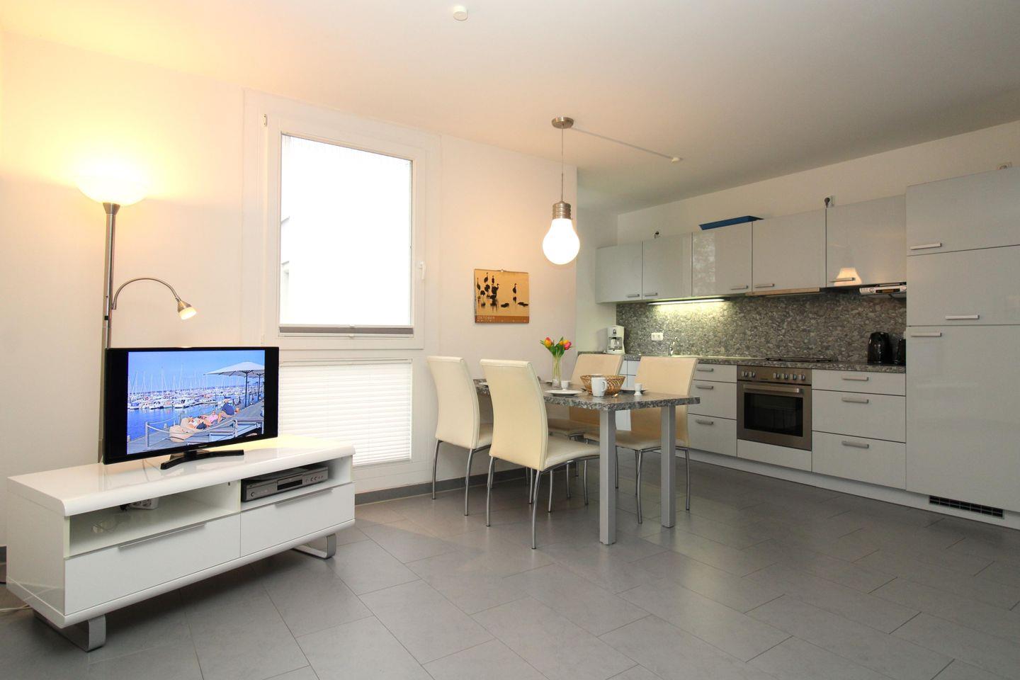 Die freundliche, helle und moderne 3-Zimmer-Wohnung (ca. 70 m²) im Erdgeschoss besitzt ein hohes Maß an Funktionalität und ist komplett eingerichtet. Alle Fußböden der Fewo sind gefliest und verfügen über eine Fußbodenheizung.