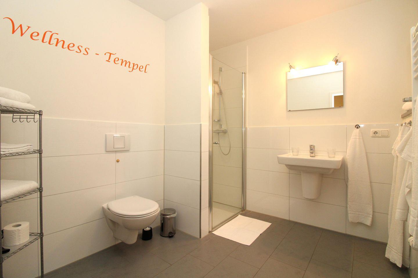 Das moderne und geräumige Badezimmer (mit Tageslicht / Fenster) verfügt über eine Echtglas-Dusche mit bodengleichem Einstieg (seniorenfreundlich!), Waschbecken mit Spiegel, WC, Föhn, Handtuch-Heizkörper sowie ausreichend Ablagemöglichkeiten.