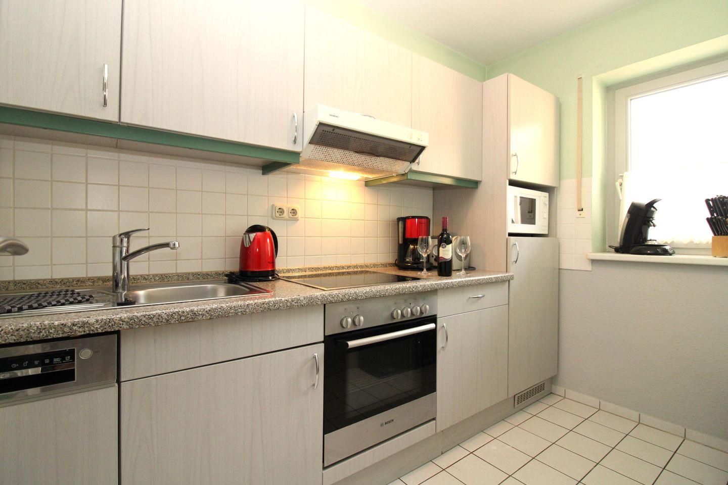 Die separate Küche (mit Fenster) beinhaltet eine voll ausgestattete Einbauküchenzeile mit 4-Zonen-Ceran-Kochfeld, Backofen, Dunstabzug, Mikrowelle, Kühlschrank mit Gefrierfach, Geschirrspülmaschine, Kaffeemaschine, Senseo-Maschine, Wasserkocher und Toaster. Die Küche ist mit Geschirr, Gläsern, Besteck und Töpfen vollständig ausgestattet.