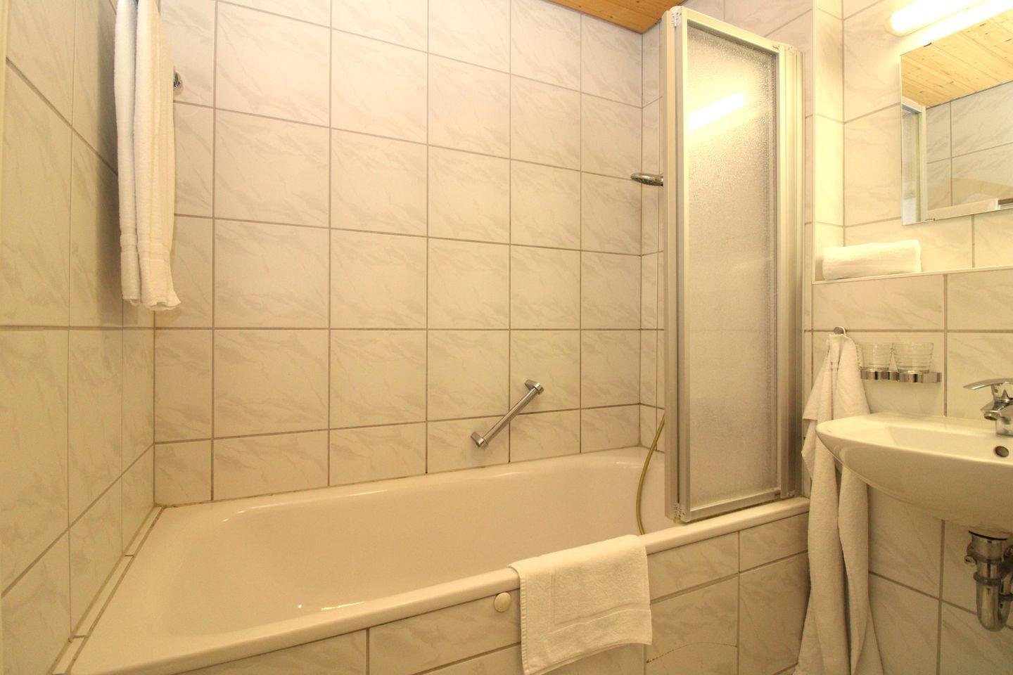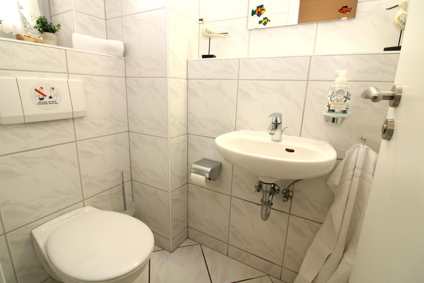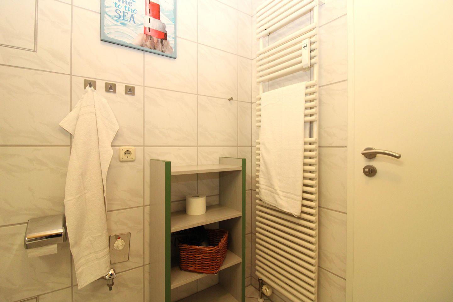 Das freundliche Badezimmer verfügt über eine Badewanne mit Duschabtrennung, Waschbecken, WC, Föhn, Handtuch-Heizkörper sowie ausreichend Ablagemöglichkeiten. In der unteren Etage befindet sich noch eine zusätzliche Gäste-Toilette mit Waschbecken, WC und Tageslicht (Fenster).