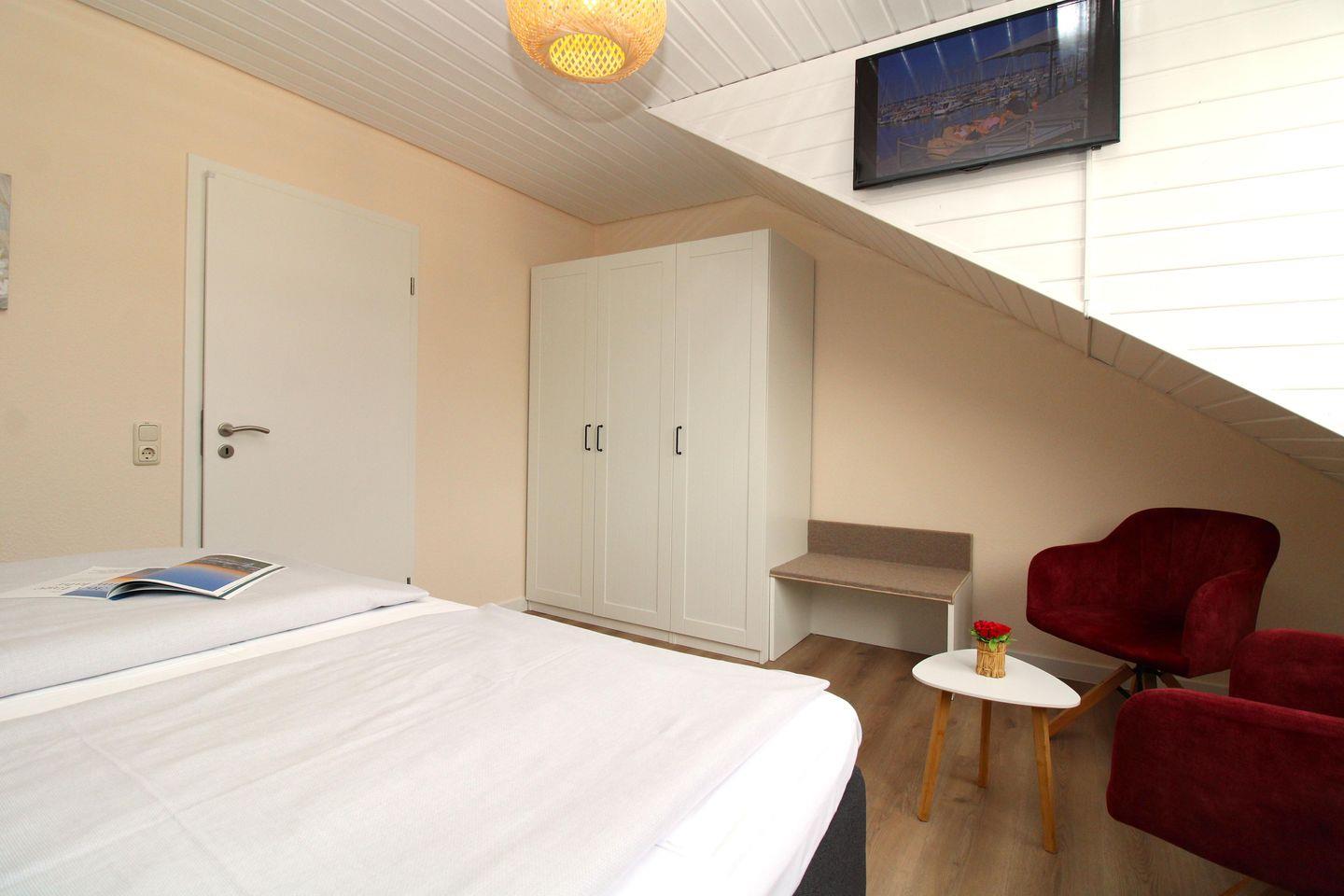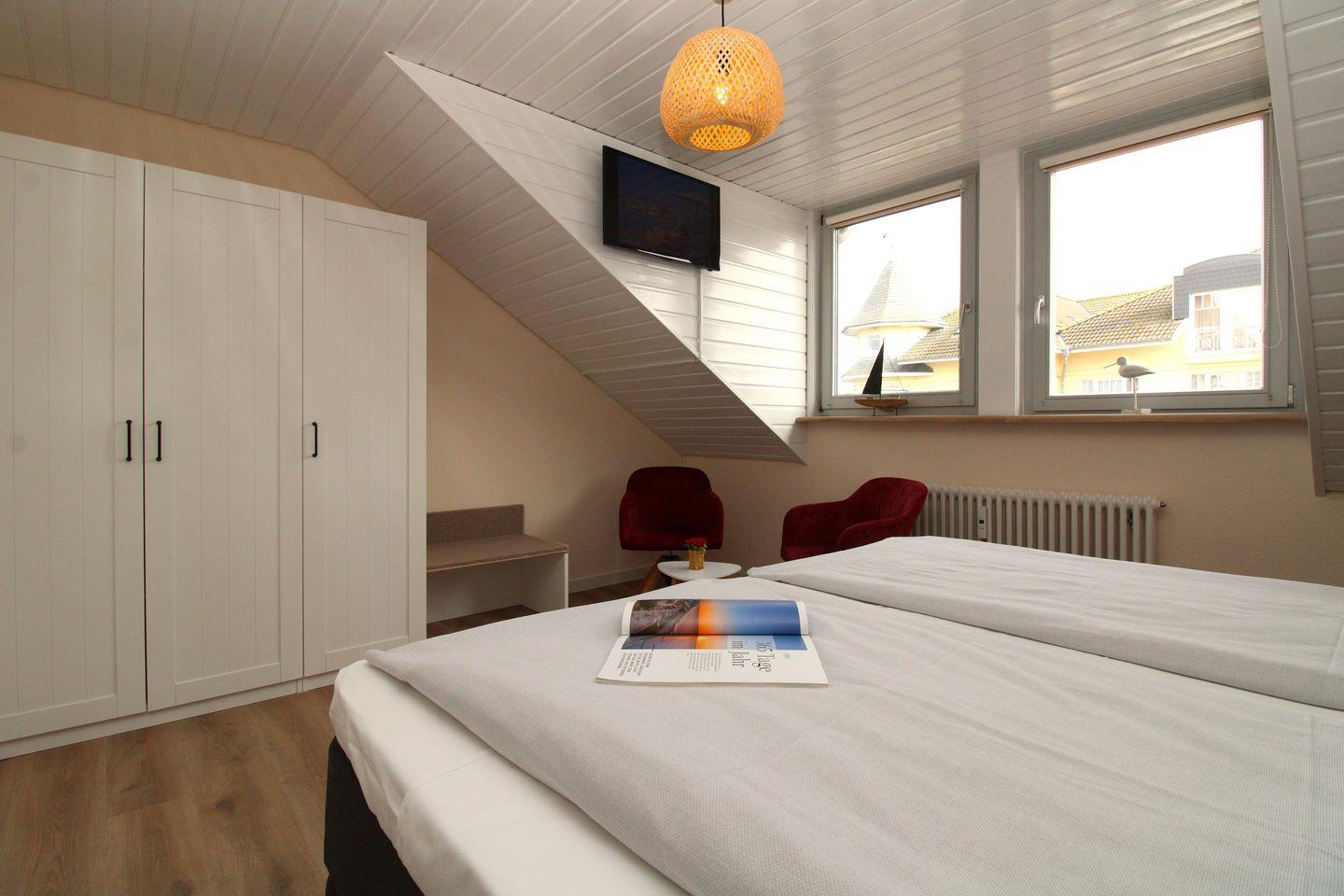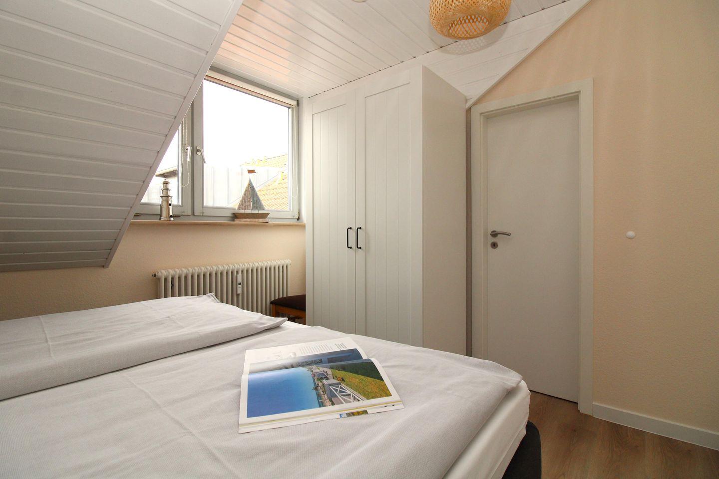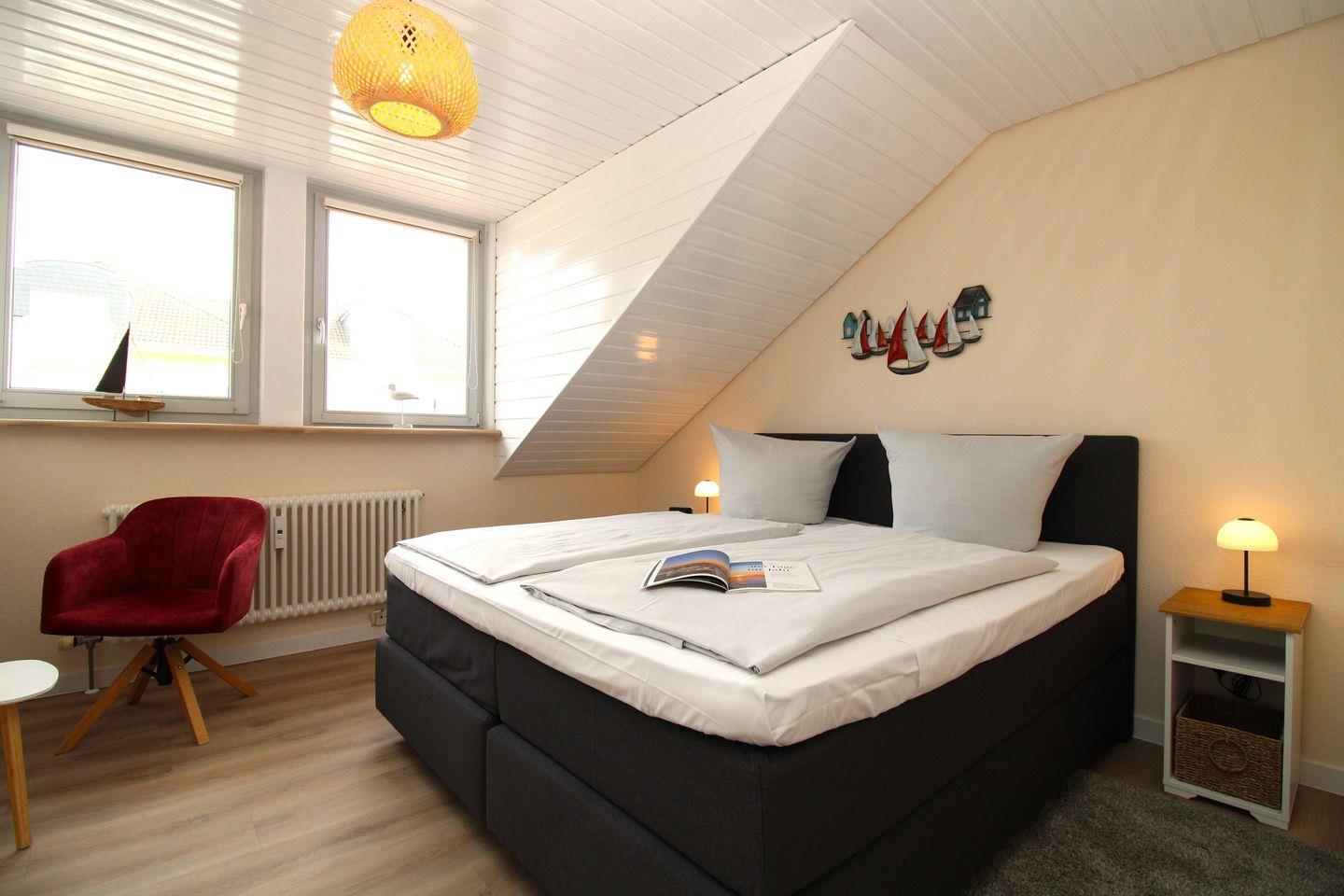 Das helle und freundliche 1. Schlafzimmer ist mit einem bequemen Boxspring-Doppelbett (180 x 200 cm), Nachttischen mit Lampen, einem geräumigen Kleiderschrank, einer Kofferablage sowie einem kleinen Tisch mit 2 Stühlen eingerichtet. Darüber hinaus verfügt dieses Zimmer über ein modernes Flachbild-TV-Gerät.