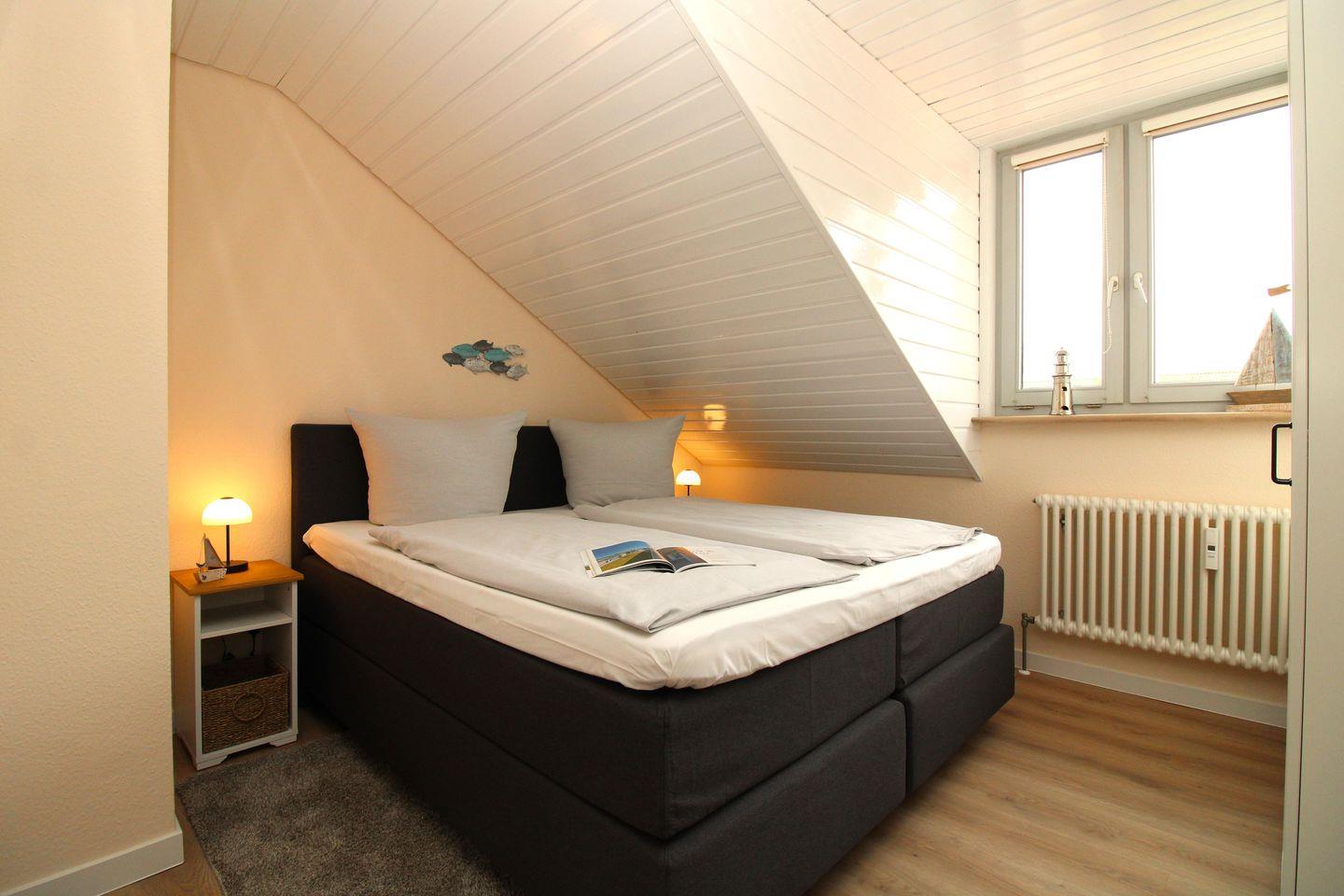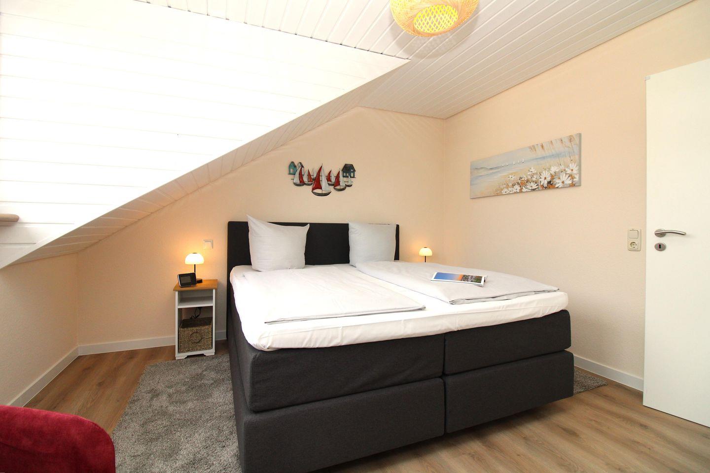 Das separate 2. Schlafzimmer ist ebenfalls mit einem bequemen Boxspring-Doppelbett (180 x 200 cm), Nachttischen sowie einem Kleiderschrank eingerichtet.