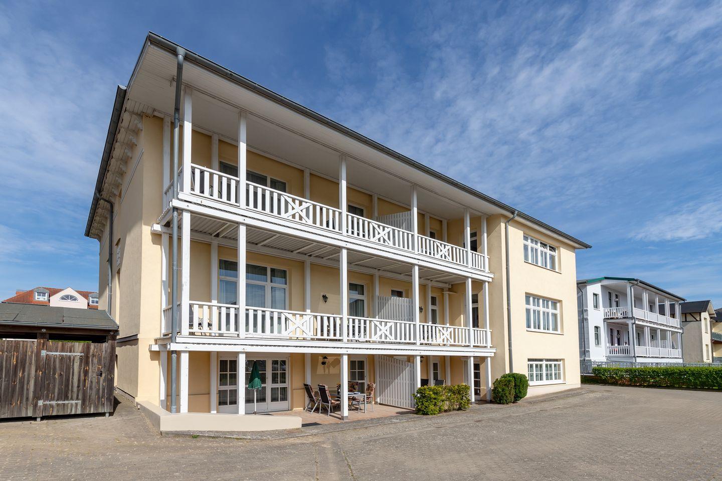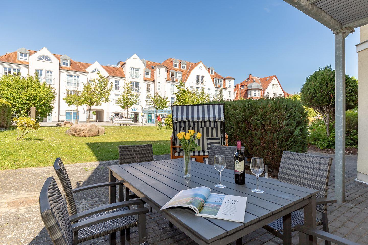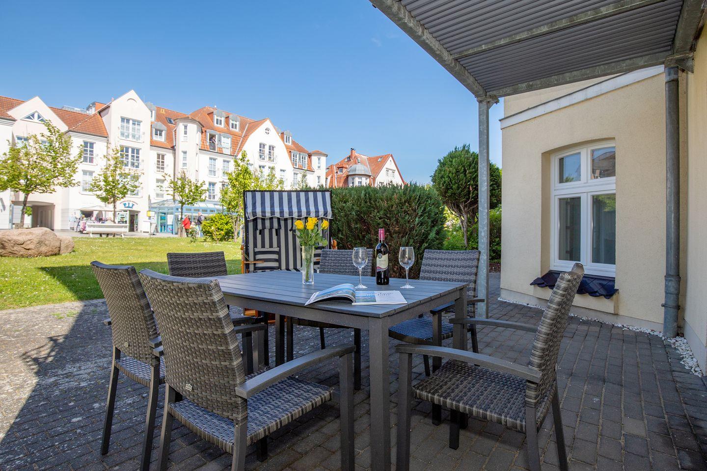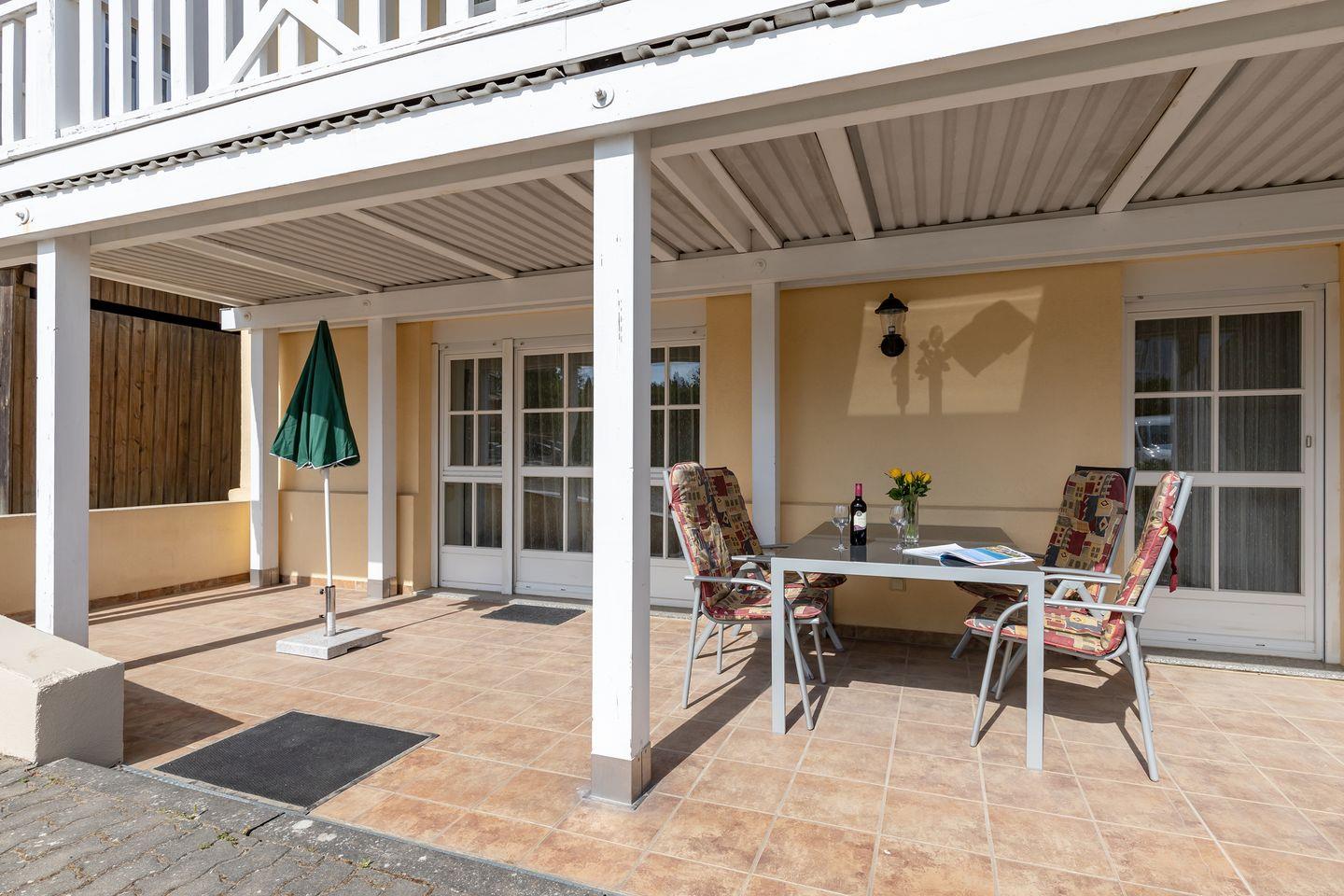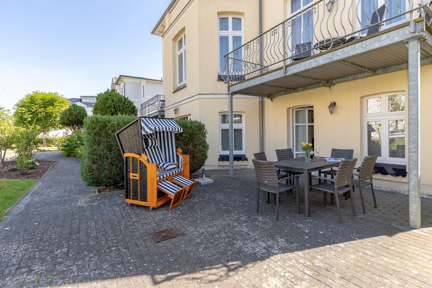 Die Wohnung verfügt über 2 ebenerdige - nach Osten (Morgensonne!) und teilweise Süden bzw. nach Westen ausgerichtete - große und teilweise überdachte Terrassen (ca. 15 m² bzw. 40 m²), die Sie vom Wohnzimmer bzw. den beiden Schlafzimmern aus erreichen. Auf der Wohnzimmerterrasse steht Ihnen darüber hinaus ein Strandkorb zur Verfügung. Hier sitzen Sie entspannt und können bei einer guten Flasche Wein die lauen Sommernächte genießen!