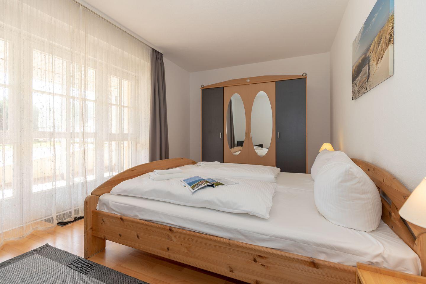 Das separate 2. Schlafzimmer ist ebenfalls mit einem bequemen Doppelbett, Nachttischen und einem Kleiderschrank eingerichtet.