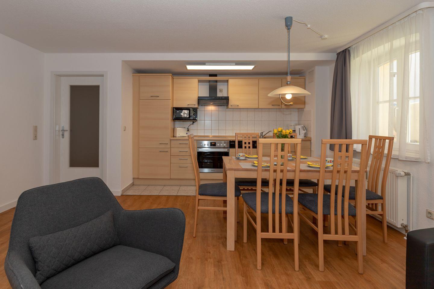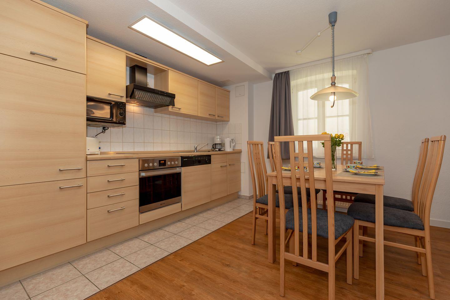 Der an den Essbereich angrenzende offene Küchenbereich beinhaltet eine komplett aus- gestattete Einbauküchenzeile mit 4-Zonen-Ceran-Kochfeld, Dunstabzug, Backofen und Mikrowelle, Kühlschrank mit Gefrierfach, Geschirrspülmaschine, Kaffeemaschine, Wasserkocher und Toaster. Die Küche ist mit Geschirr, Gläsern, Besteck und Töpfen bestens und vollständig ausgestattet.
