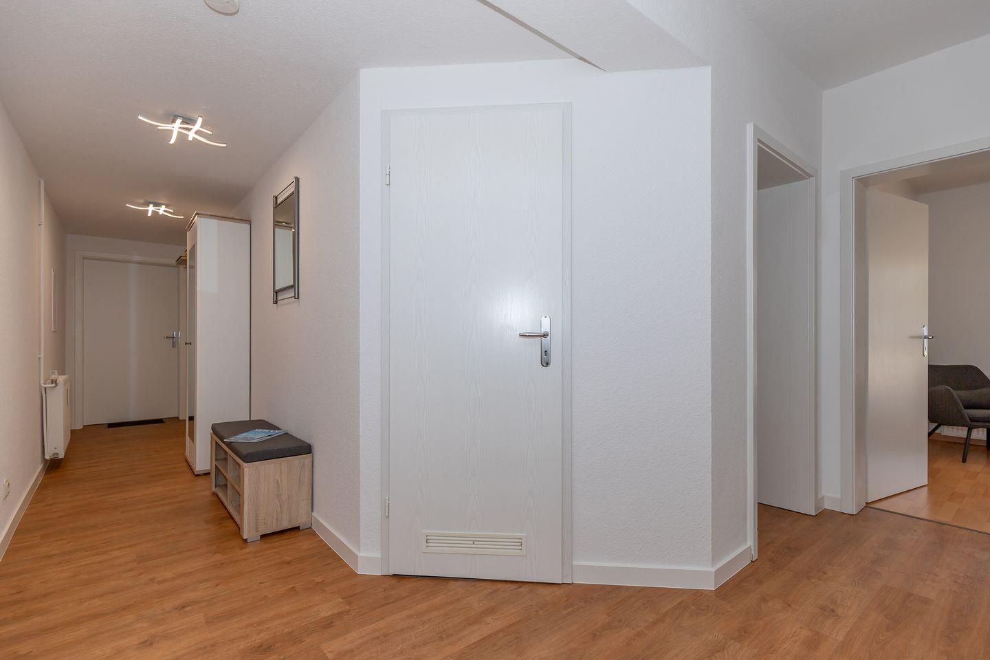 Vom großzügigen Flur mit Garderobe, Spiegel, Schrank, Sitzbank und Schuhschrank erreichen Sie bequem alle Räume Ihrer Ferienwohnung.