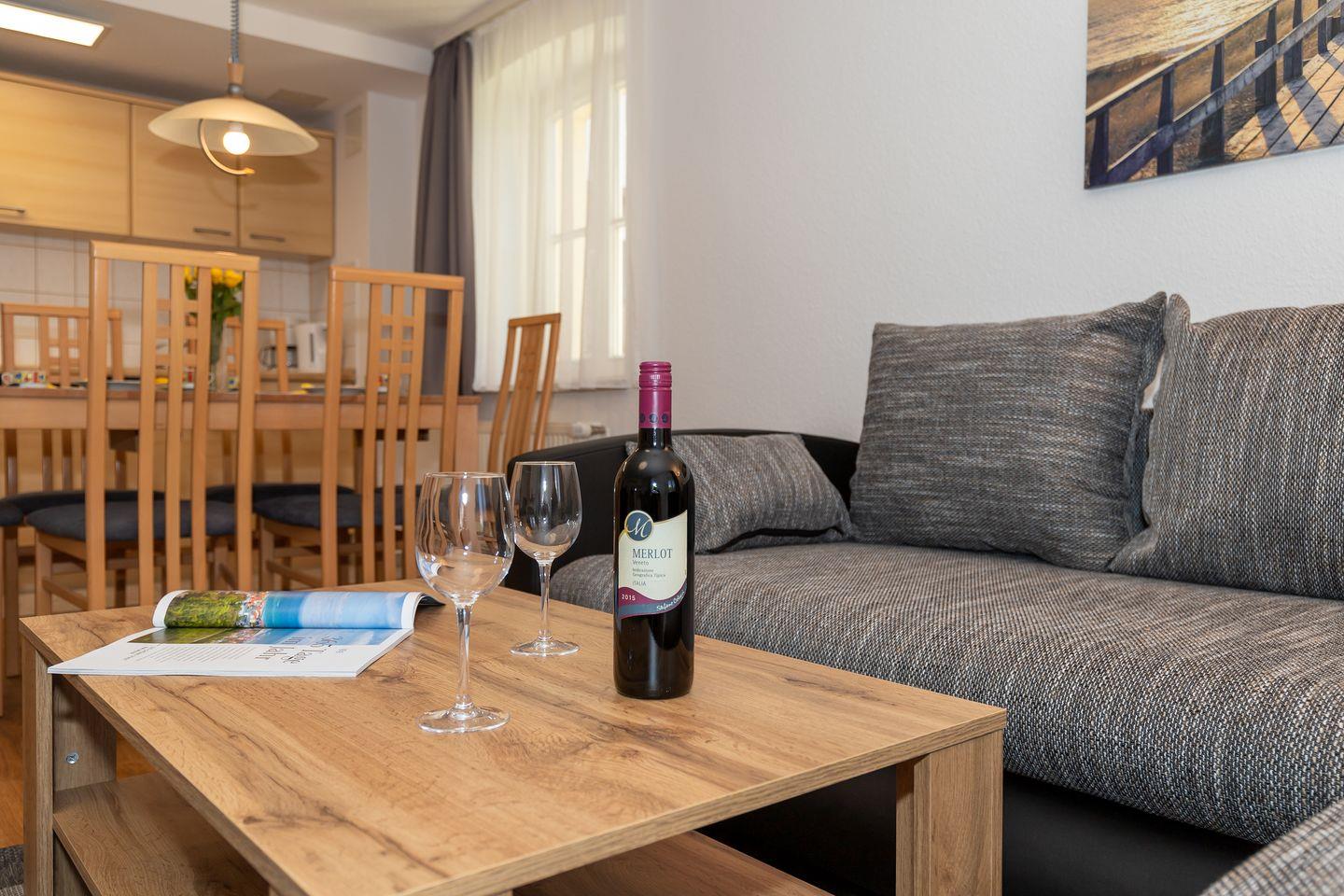 Eine zusätzliche bequeme Schlafmöglichkeit für eine weitere 5. bzw. 6. Person bietet die ausziehbare Schlafcouch im Wohnzimmer.