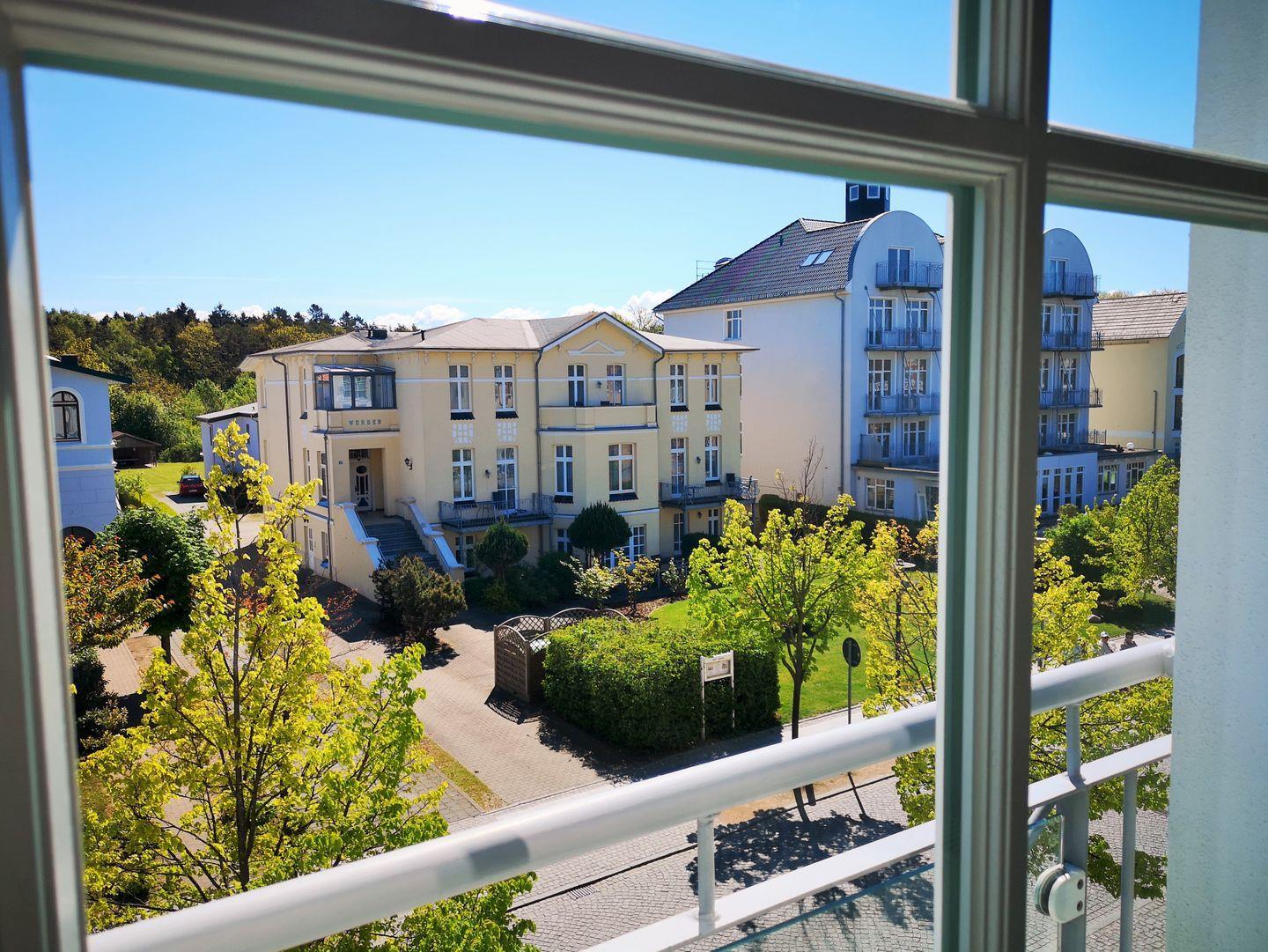 Das lichtdurchflutete und moderne Wohn-/Esszimmer verfügt über eine separate Sitzgruppe mit bequemer (Schlaf-)Couch, Sessel und Couchtisch, einen separaten Esstisch mit 4 Stühlen, ein Sideboard sowie verschiedene Regale und kleine Schränke. Vom Wohnzimmer aus haben Sie über die großen bodentiefen Fenster mit sog. französischen Balkonen einen wunderschönen Blick auf das muntere Treiben in der unten liegenden Hermannstraße. Der seitliche Blick aus den Fenstern ermöglicht Ihnen einen direkten Blick auf die nahe Ostsee.