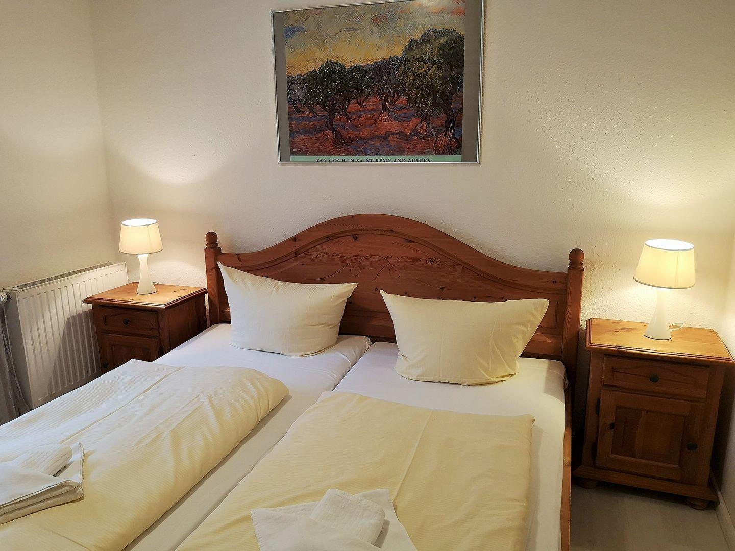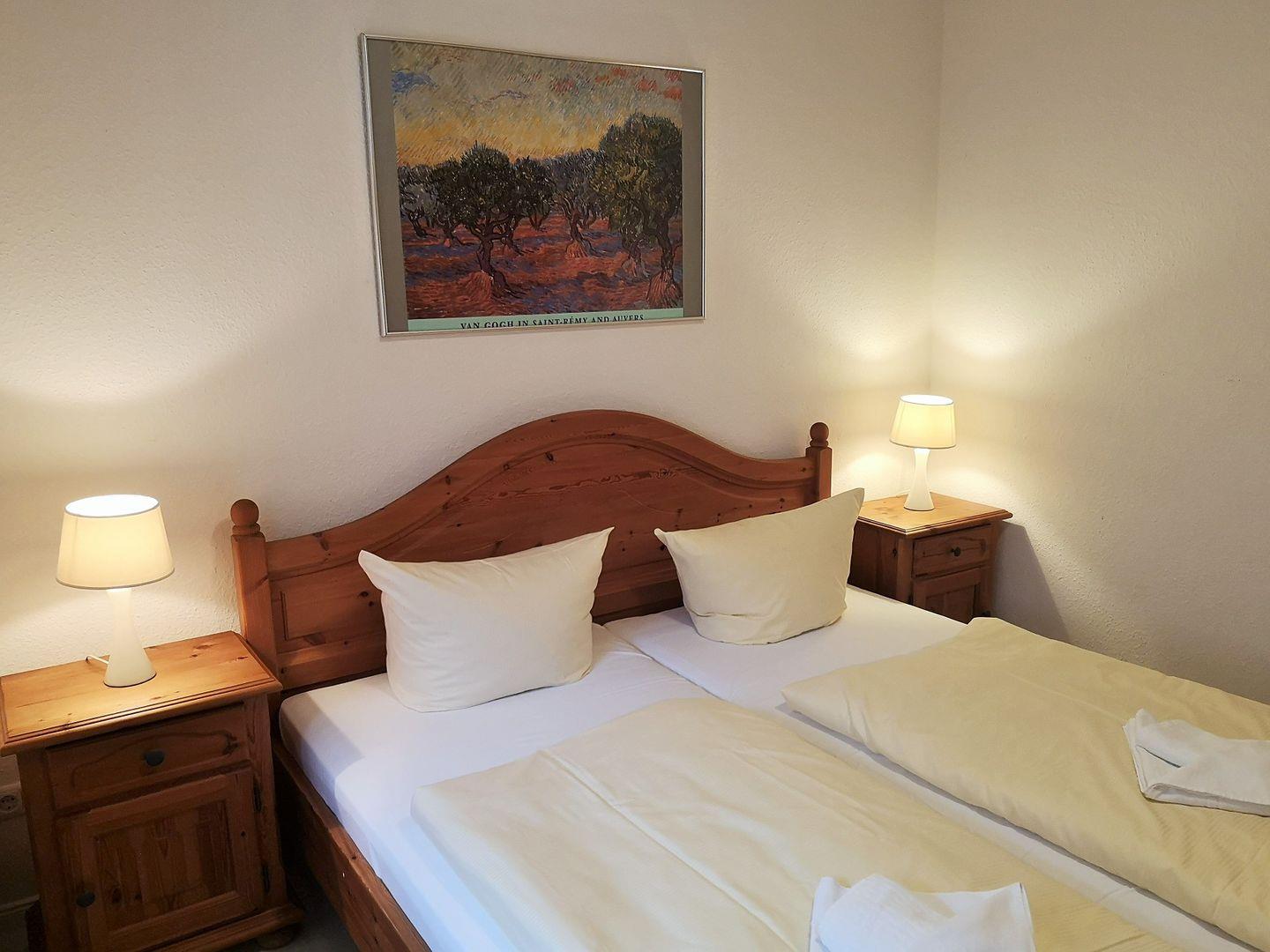 Das helle 1. Schlafzimmer ist mit einem bequemen Doppelbett, Nachttischen sowie einem Kleiderschrank eingerichtet und hat einen direkten Zugang zur Terrasse.