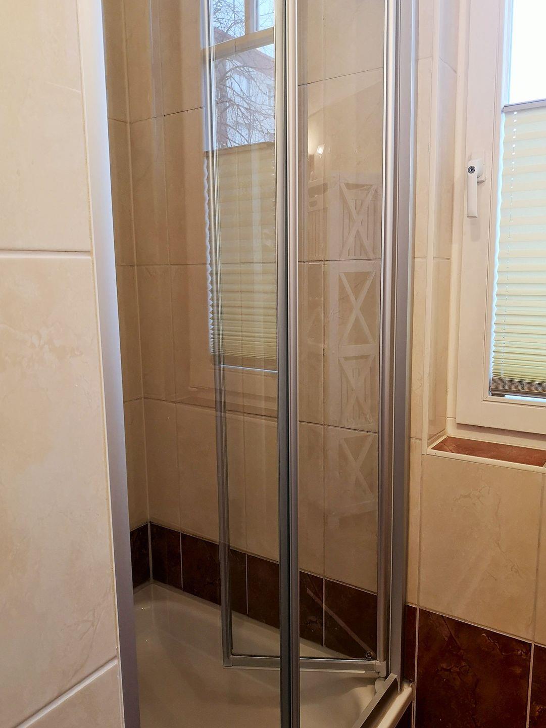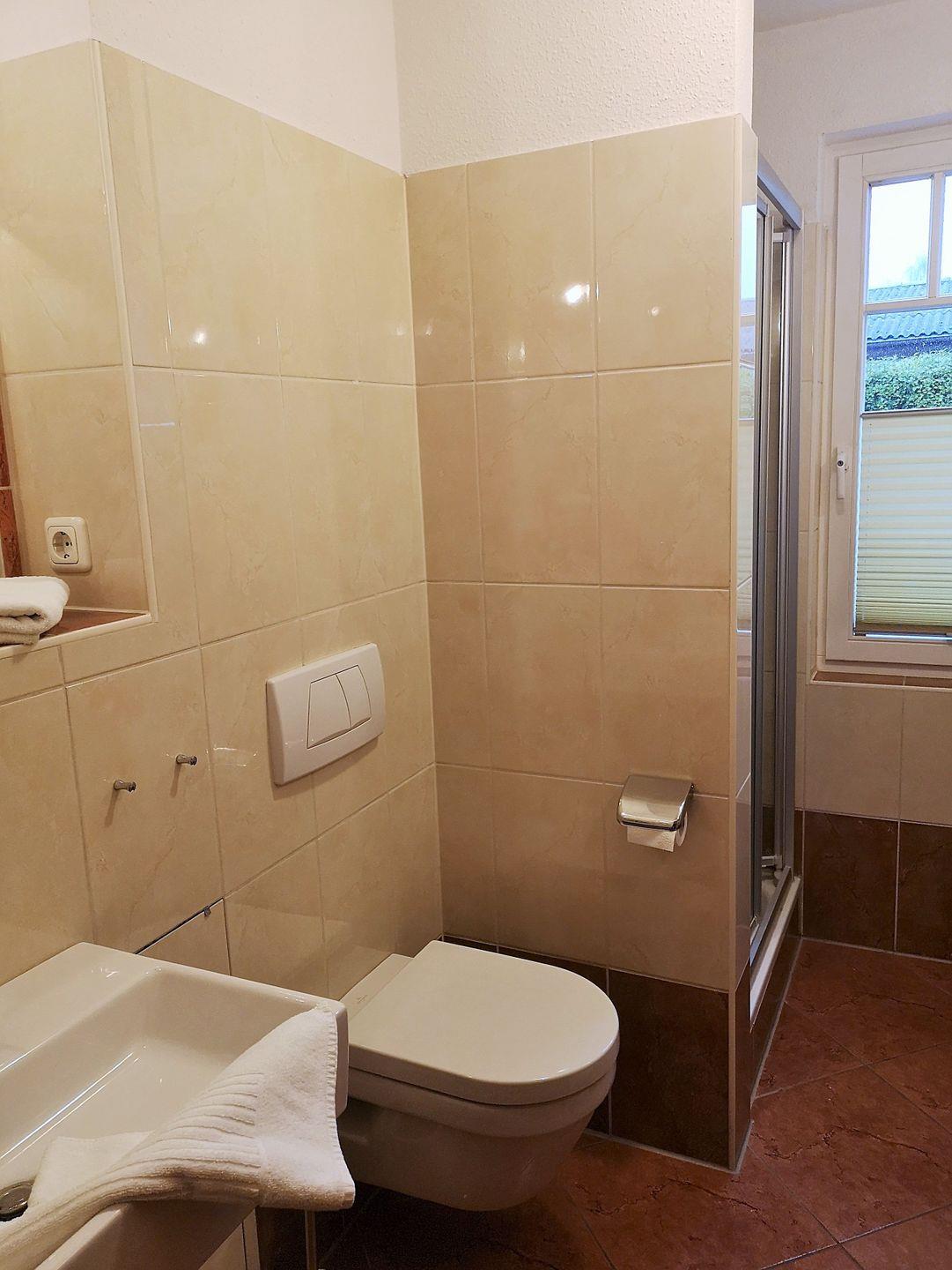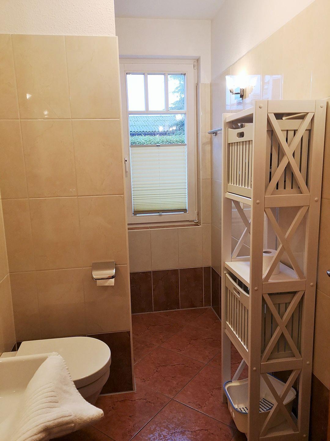 Das geräumige und moderne Badezimmer (mit Tageslicht / Fenster) verfügt über eine Dusche, WC, ein Badezimmerregal sowie ausreichend sonstige Ablagemöglichkeiten.