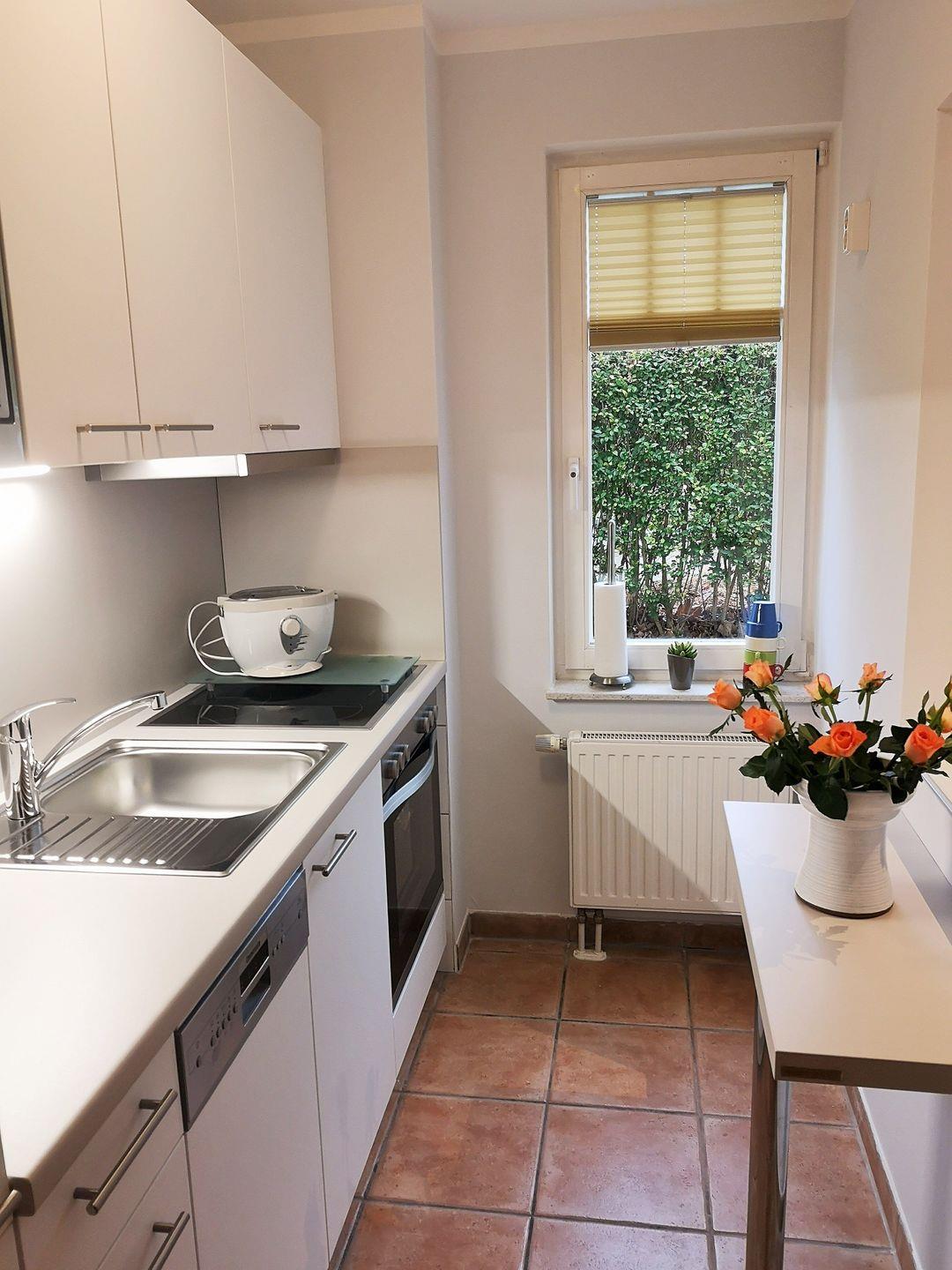 Die separate Küche (mit Durchreiche zum Wohn-/Esszimmer) beinhaltet eine voll ausgestattete Einbauküchenzeile mit 4-Platten-Ceran-Kochfeld, Backofen, Dunstabzug, Mikrowelle, Kühlschrank mit Gefrierfach, Geschirrspülmaschine, Kaffeemaschine, Wasserkocher und Toaster. Die Küche ist mit Geschirr, Gläsern, Besteck und Töpfen bestens und ausreichend ausgestattet.
