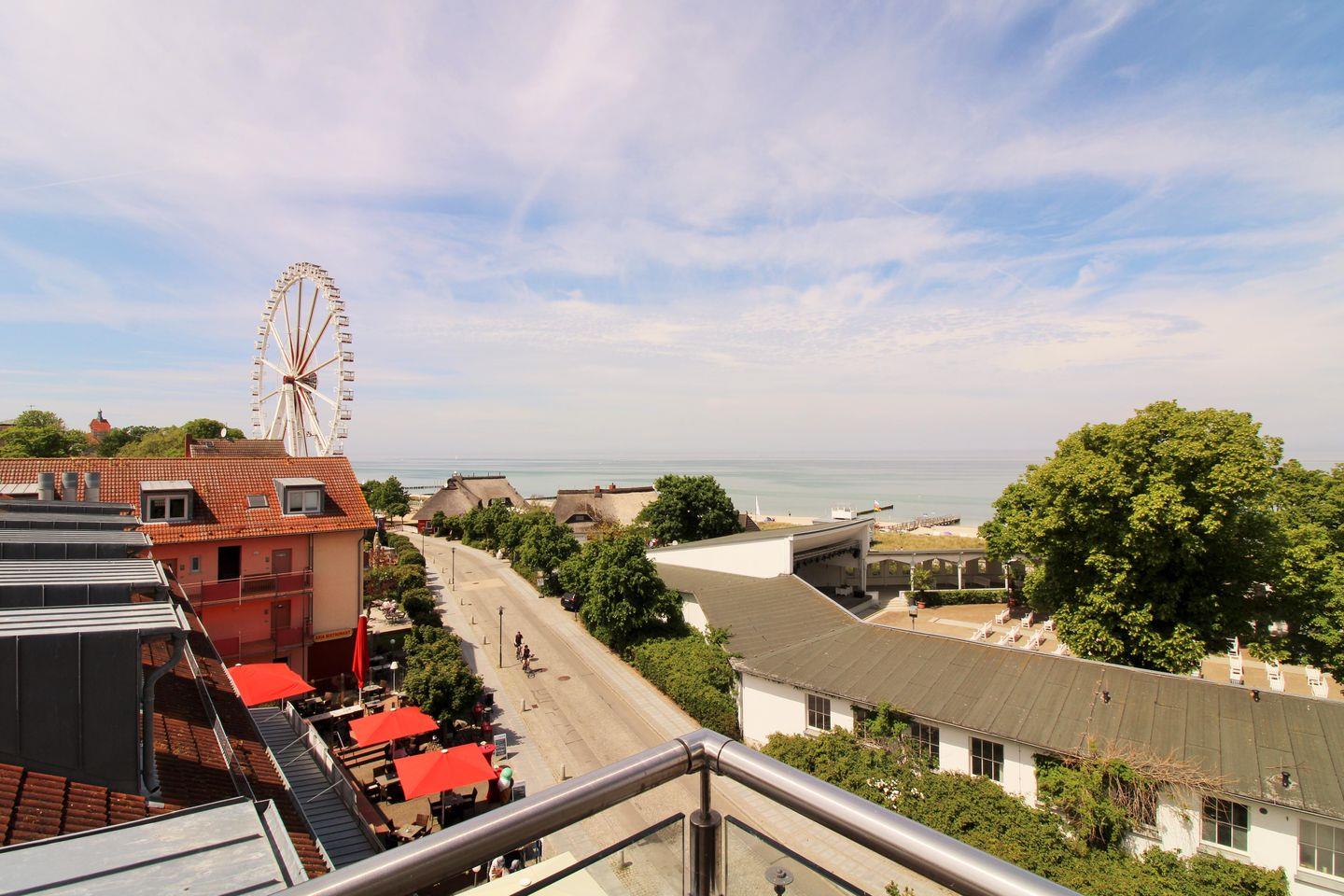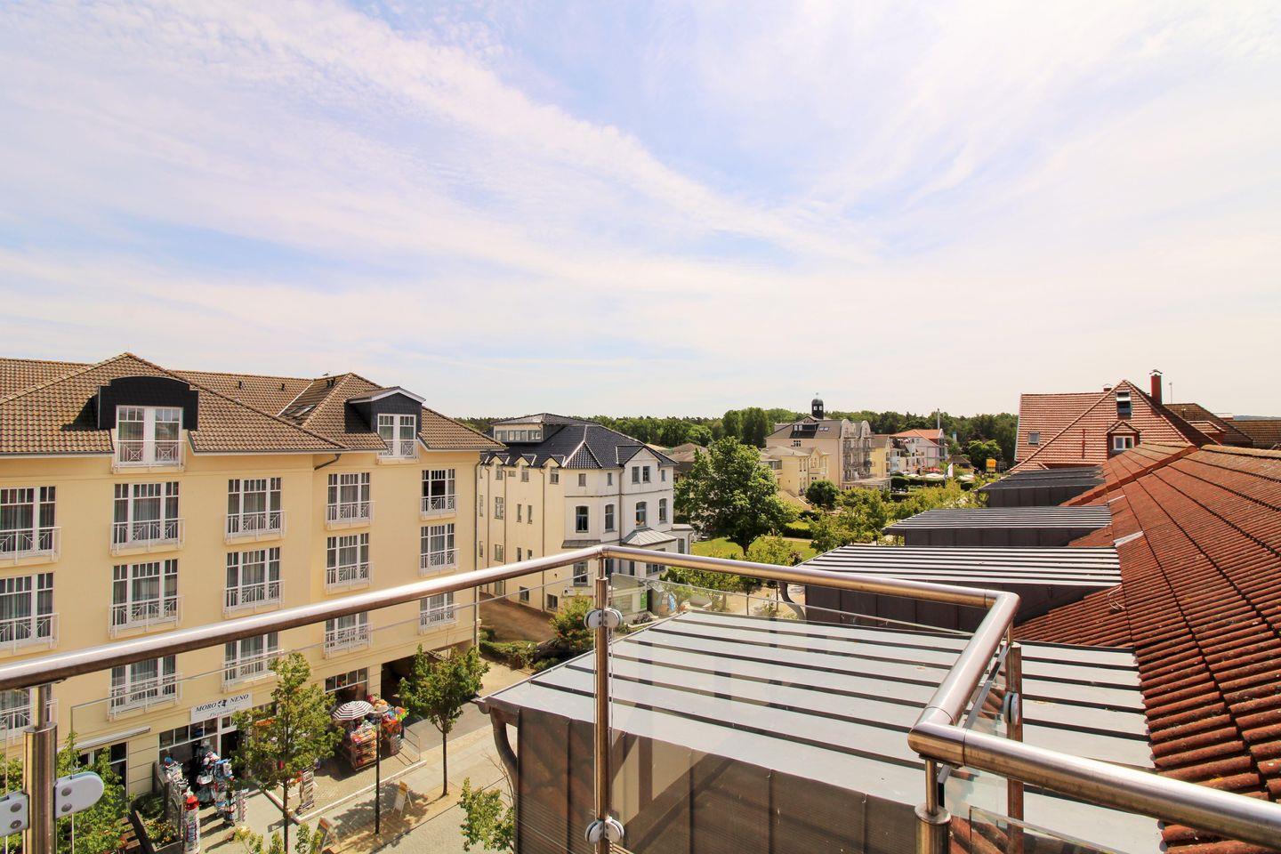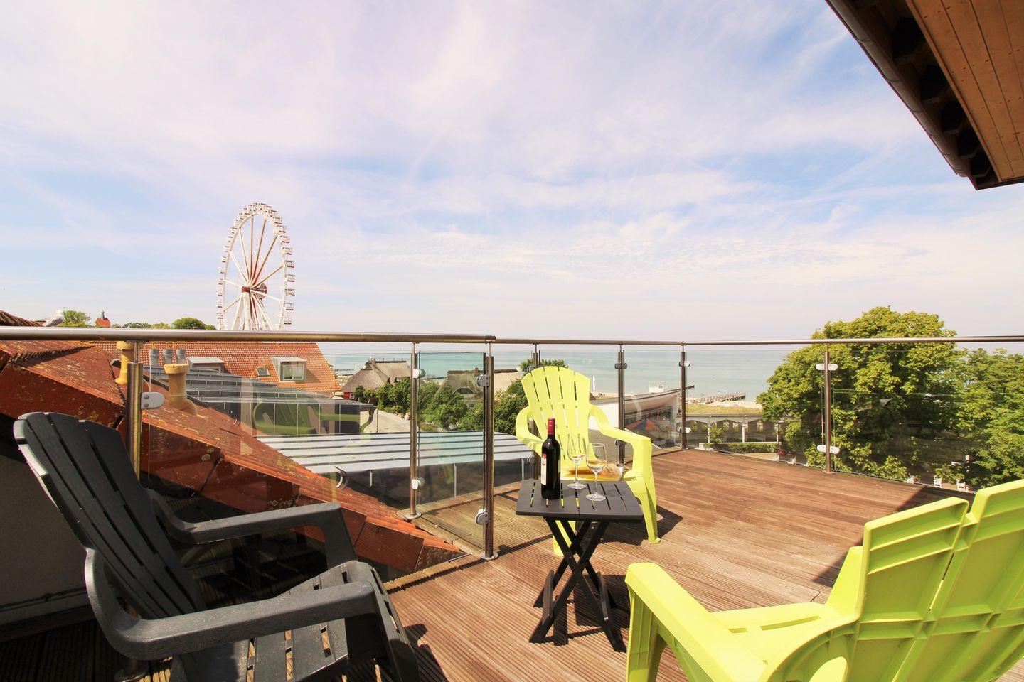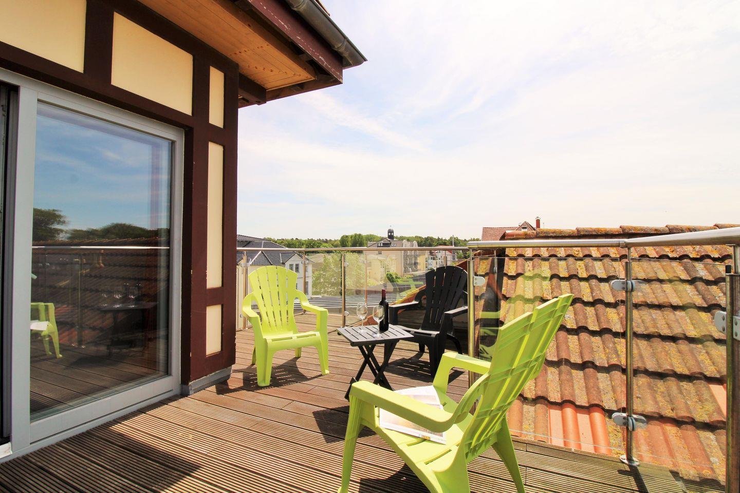 Die Wohnung verfügt im Untergeschoss über einen ca. 5 m² großen möblierten Balkon (nach Süd-Osten ausgerichtet), den Sie vom Esszimmer aus erreichen. Im Obergeschoss des Appartements haben Sie weiterhin eine sehr große möblierte Dachterrasse (ca. 20 m²). Hier erwartet Sie ein beeindruckender und fantastischer freier Panoramablick über die Dächer von Kühlungsborn sowie die unendlich scheinende Ostsee. Diese besondere Location bietet sich an, um unvergessliche Sonnenauf- und -untergänge zu erleben, entspannt die Weite des Meers zu genießen, zu träumen oder abends bei einem guten Glas Wein in Ruhe die lauen Sommernächte zu genießen!