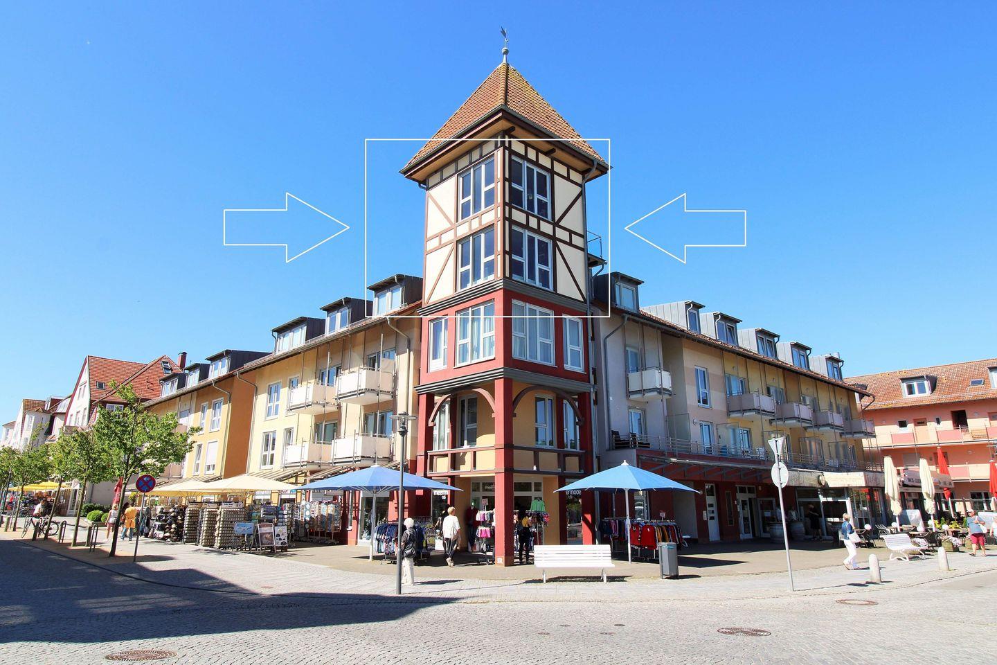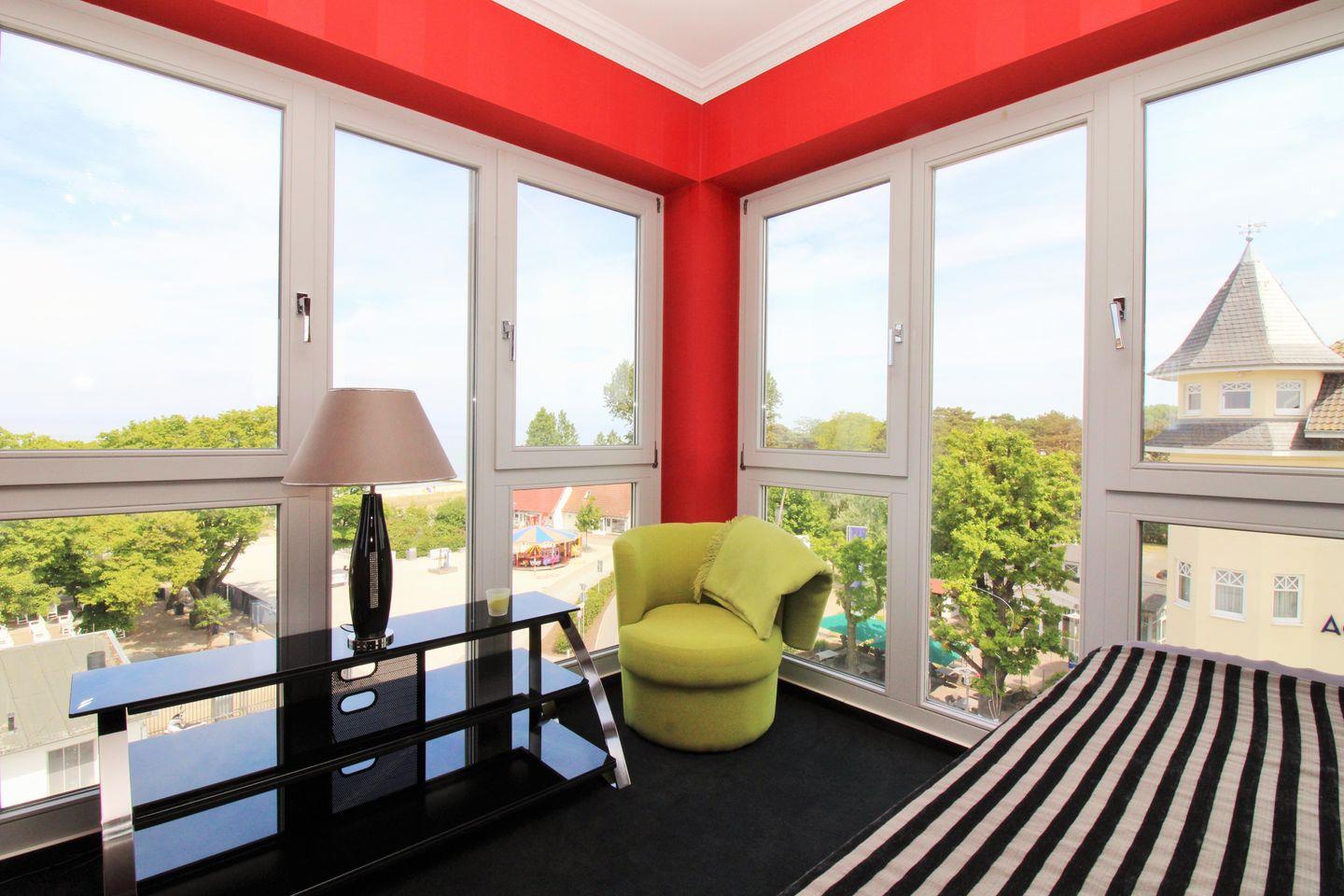 Bereits beim Betreten der Suite eröffnet sich ein sehr großzügiges und komfortables Turmappartement. Die bodentiefen French-Windows im Wohnzimmer sowie im Schlafzimmer des Obergeschosses bieten Ihnen einen atemberaubenden und wunderschönen direkten Weitblick auf die unmittelbar vor der Appartementanlage verlaufende Ostsee und Strandpromenade!