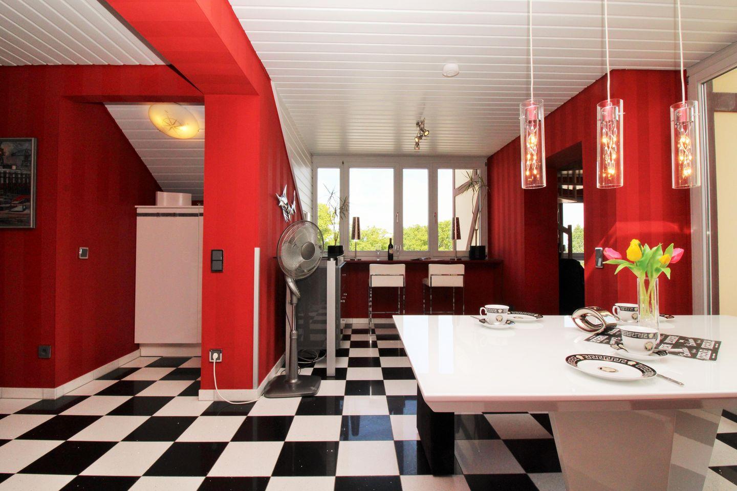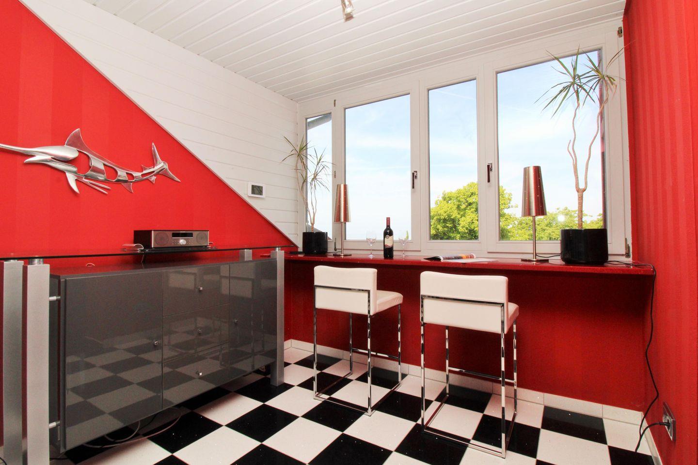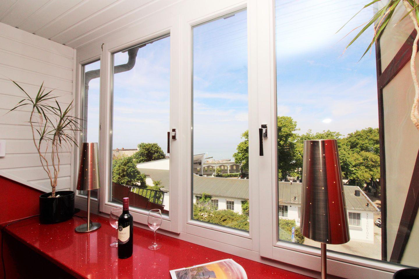 Der halb offene Küchen- bzw. Essbereich beinhaltet eine voll ausgestattete Einbauküchenzeile mit 4-Platten-Ceran-Kochfeld, Backofen, Dunstabzug, Kühlschrank mit Gefrierfach, Geschirrspülmaschine, Kaffeemaschine, Wasserkocher und Toaster. Die Küche ist mit Geschirr, Gläsern, Besteck und Töpfen bestens und ausreichend ausgestattet. Zum Genuss Ihrer Mahlzeiten gibt es 2 Möglichkeiten: Sie können wählen zwischen dem Frühstückstresen mit Bistrohockern direkt am Fenster und freiem weitem Blick auf die vor Ihnen liegende Ostsee oder dem gemütlichen und großzügigen Esszimmertisch mit bequemen Sitzbänken und Stühlen.