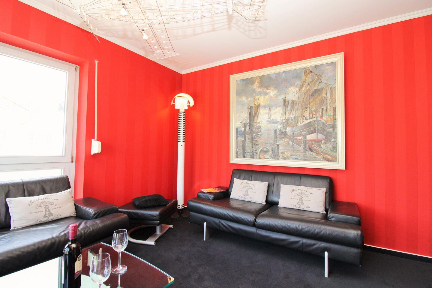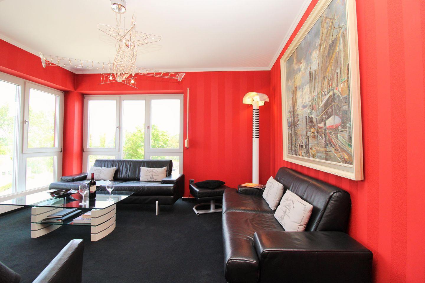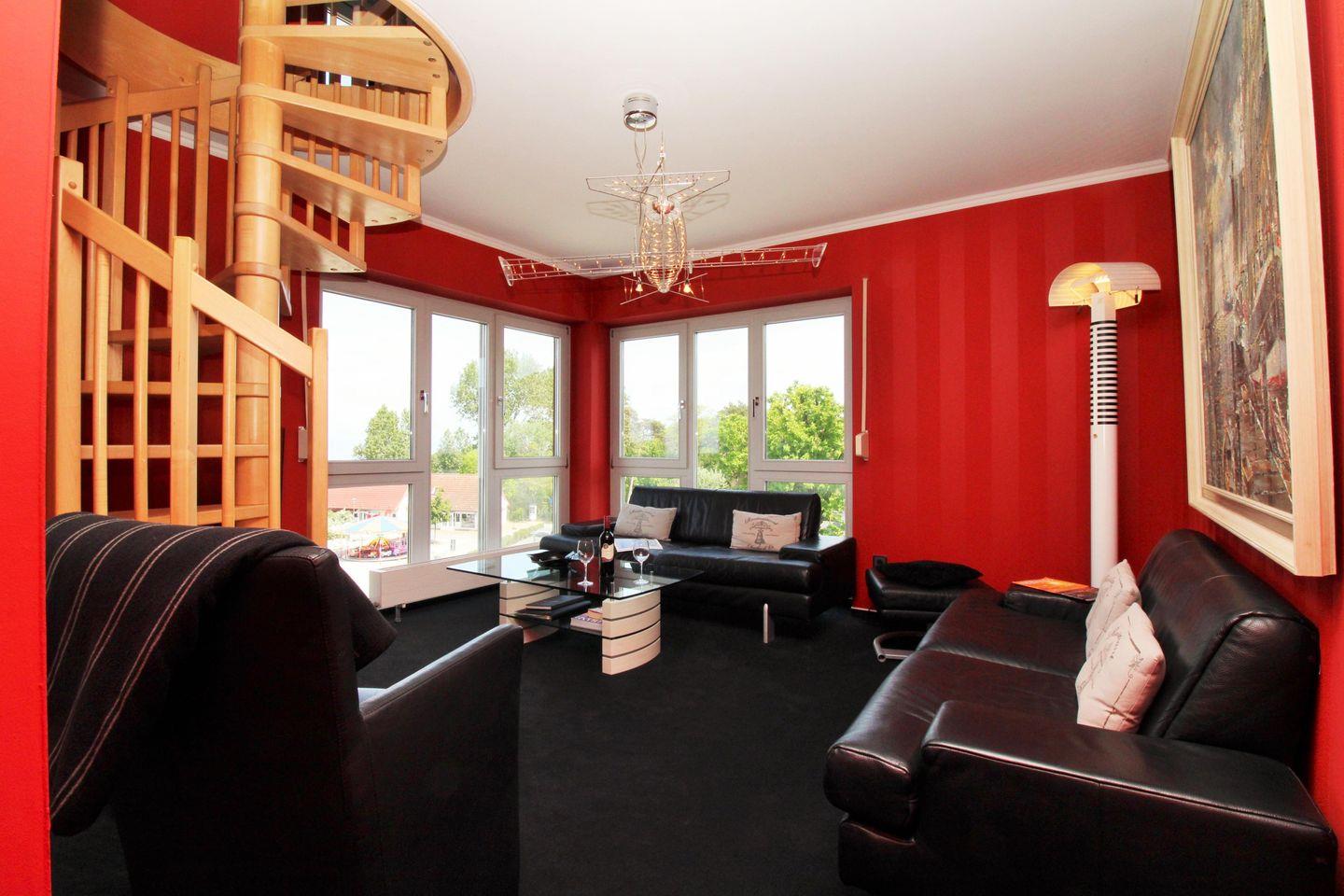 Das elegante und lichtdurchflutete Wohnzimmer im Turm verfügt über zwei bequeme Leder-Couchen, einen Sessel und einen Couchtisch – hier sitzen Sie entspannt und gemütlich mit einem fantastischen und traumhaften Blick auf die unmittelbar vor Ihnen liegende Ostsee!