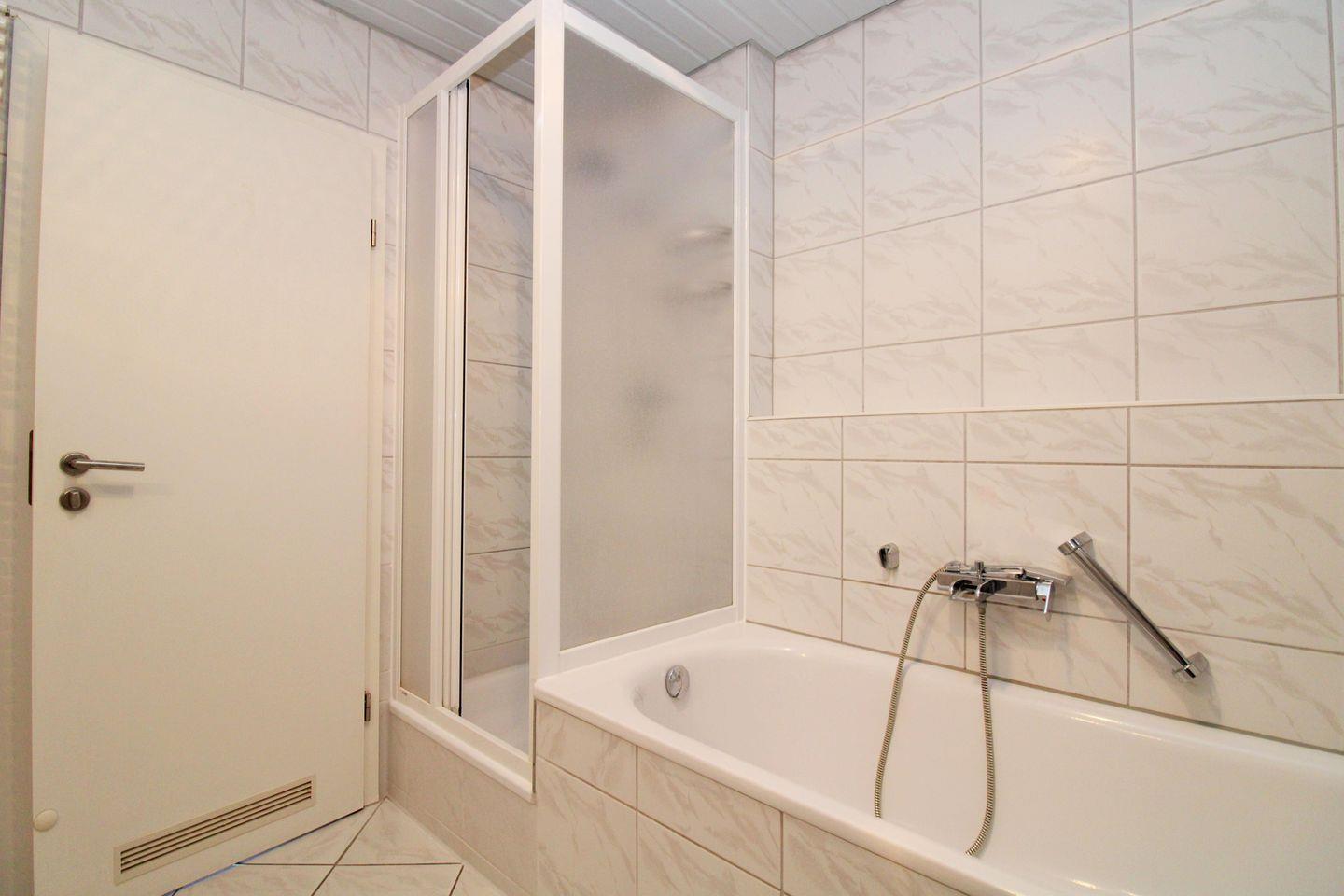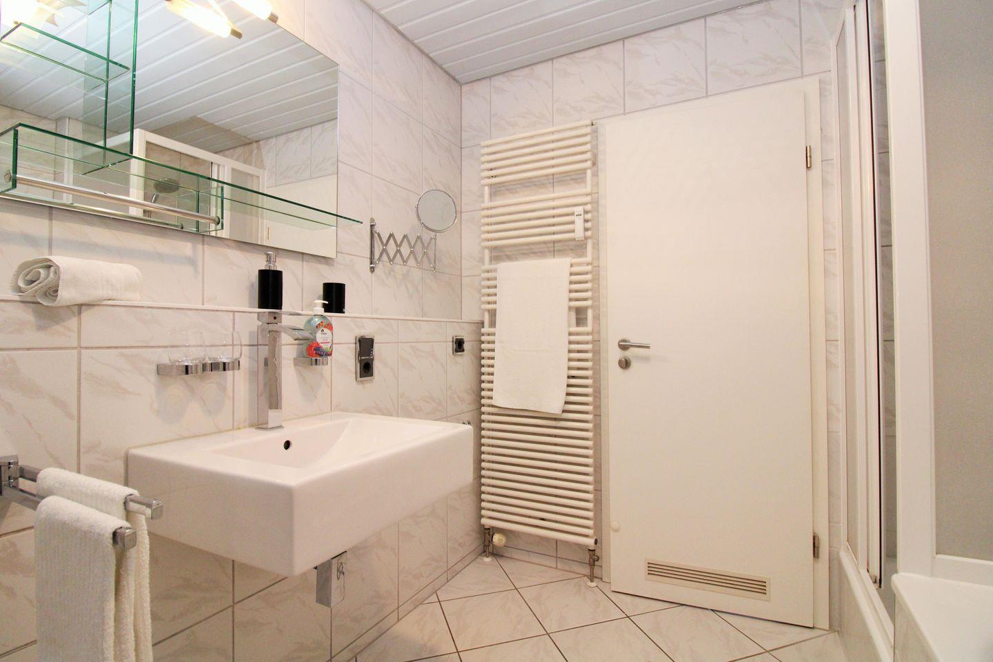 Das geräumige Badezimmer verfügt über eine Dusche sowie zusätzlich eine Badewanne, Waschbecken mit Kosmetikspiegel, WC, einen Handtuch-Heizkörper sowie ausreichend Ablagemöglichkeiten.