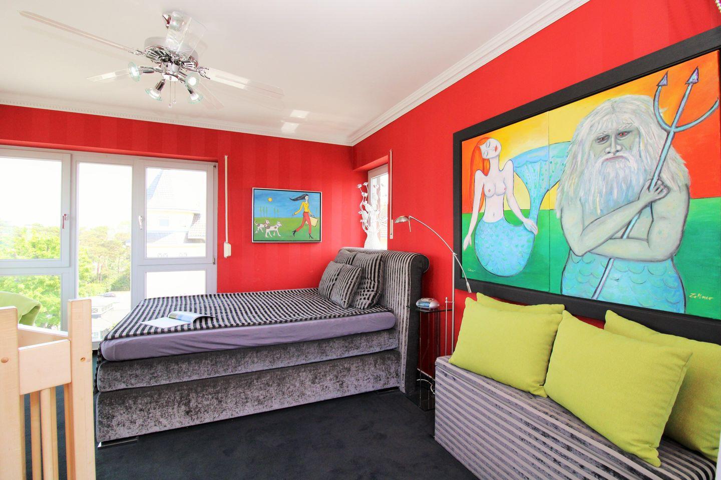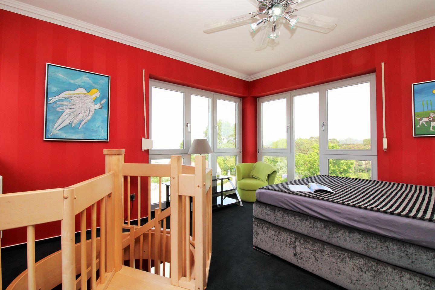 Das lichtdurchflutete und separate 2. Schlafzimmer im Turm des Obergeschosses verfügt ebenfalls über ein bequemes Doppelbett und bietet den Gästen ein besonderes Highlight: einen traumhaften Blick auf die unmittelbar vor Ihnen liegende Ostsee direkt vom Bett!