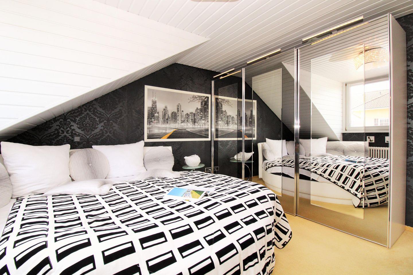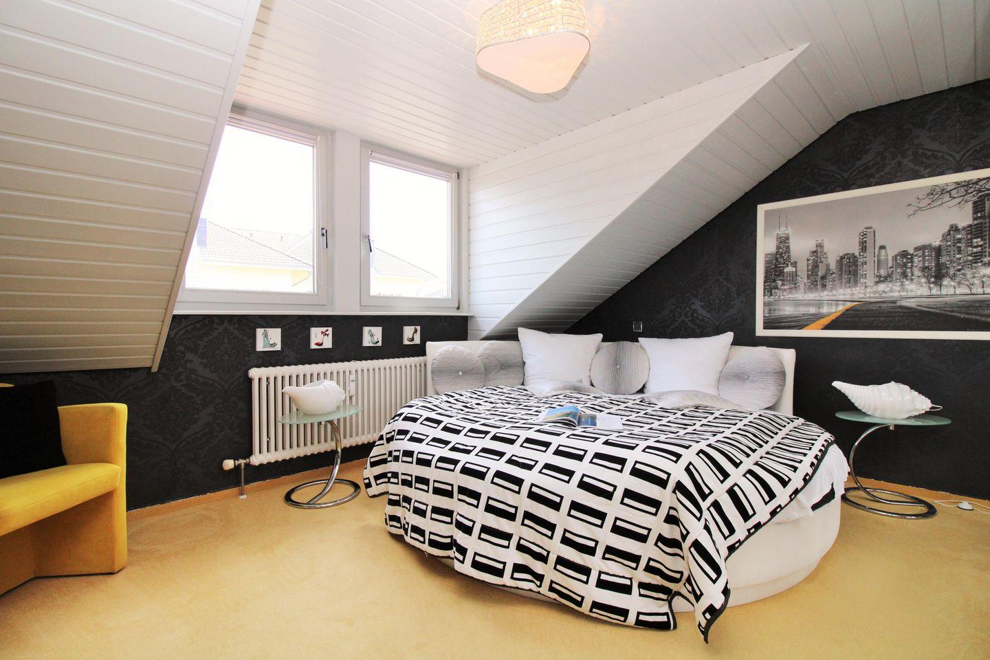 Das exklusive, sehr geräumige und hochwertig eingerichtete 1. Schlafzimmer ist mit einem bequemen runden Doppelbett, einem Sessel sowie einem sehr großen Kleiderschrank eingerichtet und verfügt für ein gemütliches Ambiente über einen romantischen elektrischen Kamin.