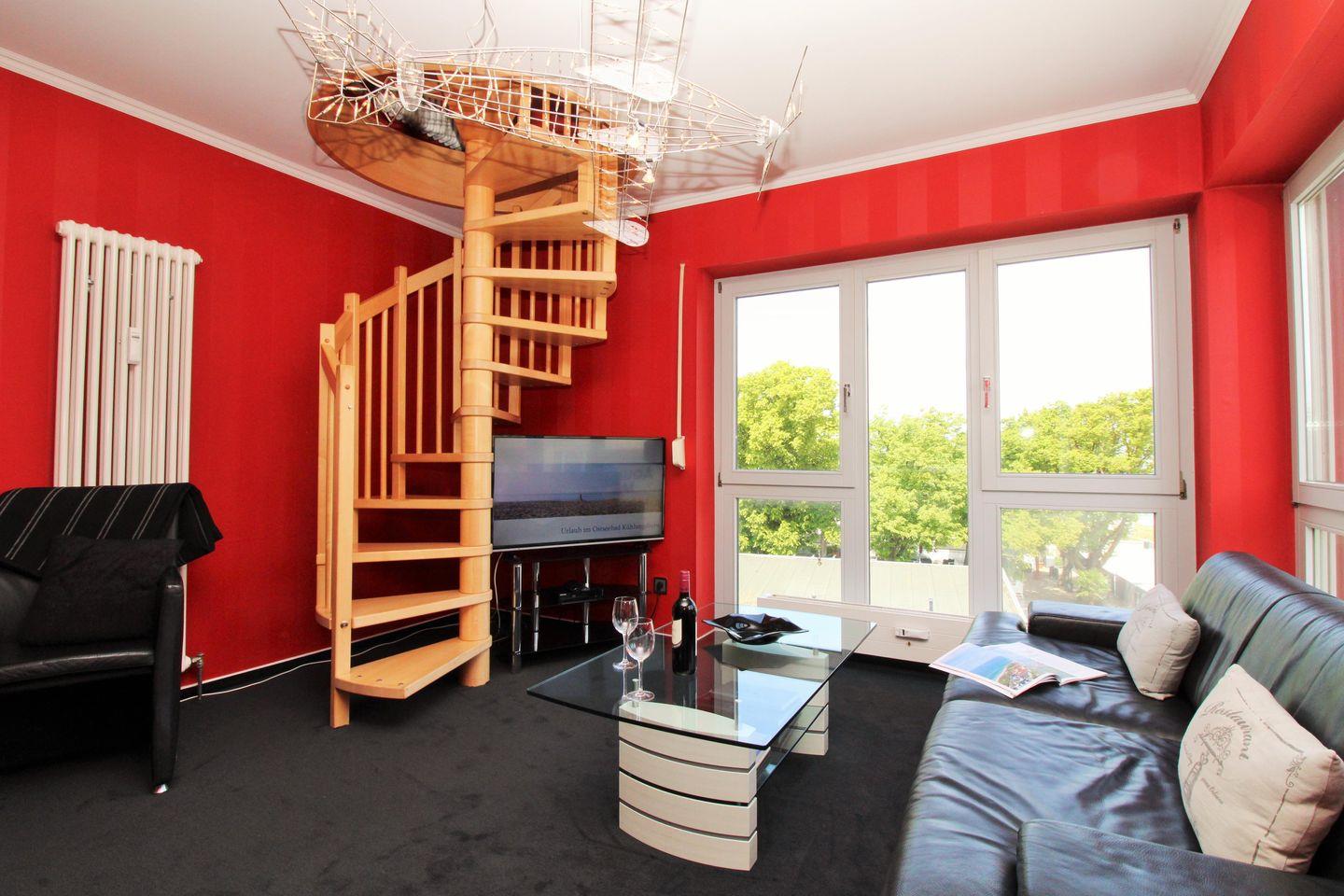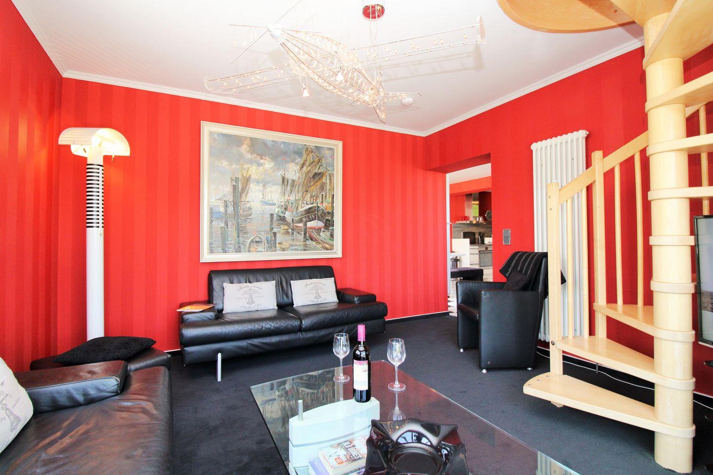 Die in unmittelbarer Strandnähe gelegene, exklusive sowie sehr hochwertig und komfortabel eingerichtete 4-Zimmer-Turmsuite (ca. 100 m²) im 3. und 4. Obergeschoss ist über eine innen liegende Treppe verbunden.