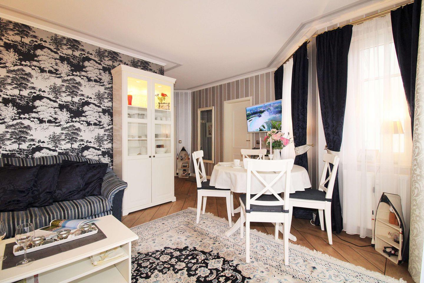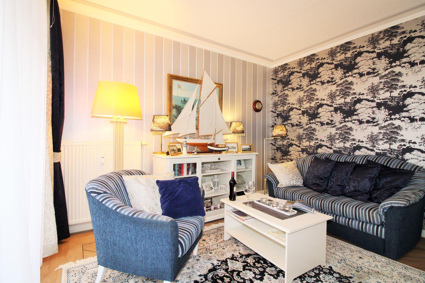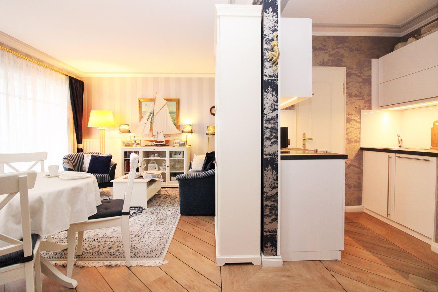 Das strandnahe und sehr schöne 2-Zimmer-Appartement (ca. 40 m²) im 1. Obergeschoss ist hochwertig und mit viel Liebe zum Detail eingerichtet. Der Fußboden der gesamten Wohnung ist maritimes Parkett, das Bad / WC ist gefliest.