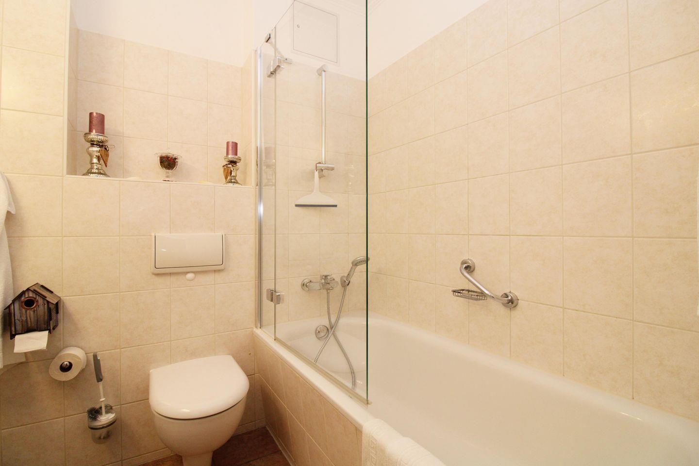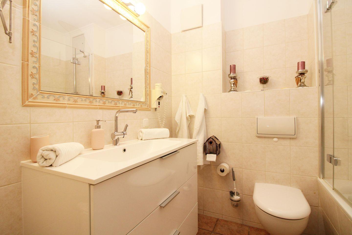 Das freundliche und mediterran anmutende Badezimmer verfügt über eine Badewanne mit Echtglas-Duschabtrennung, Waschbecken, WC, Föhn sowie ausreichend Ablage-möglichkeiten.