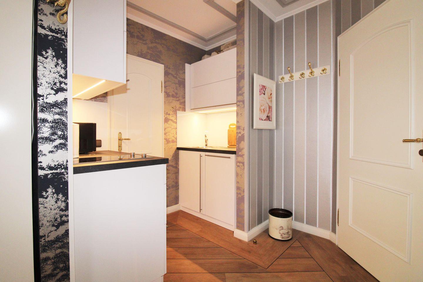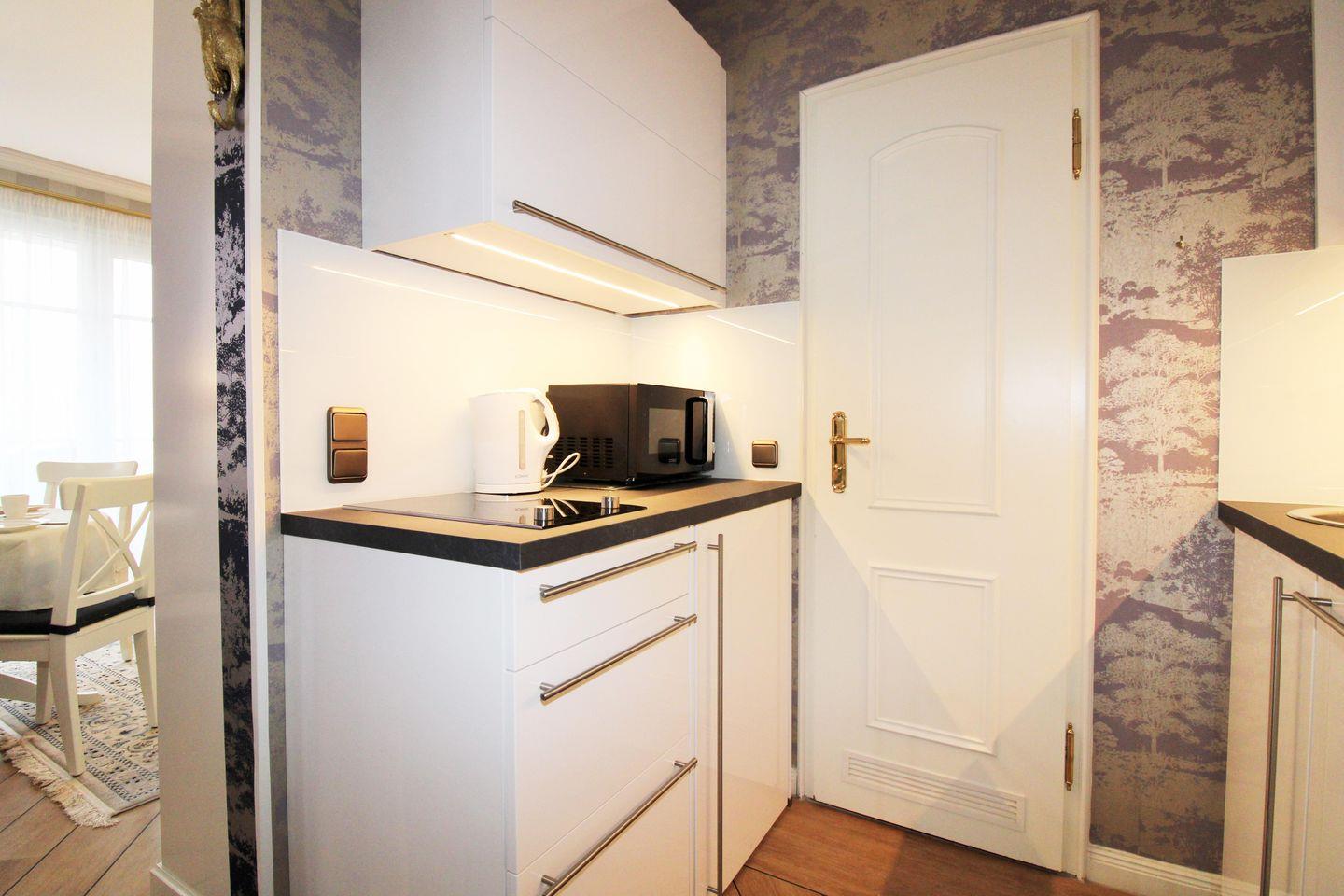 Die offene Pantry-Küche beinhaltet eine Einbauküchenzeile mit 2-Platten-Ceran-Kochfeld, Kühlschrank, Geschirrspüler, Kaffeemaschine, Wasserkocher und Toaster. Die Küche ist mit Geschirr, Gläsern, Besteck und Töpfen vollständig ausgestattet.