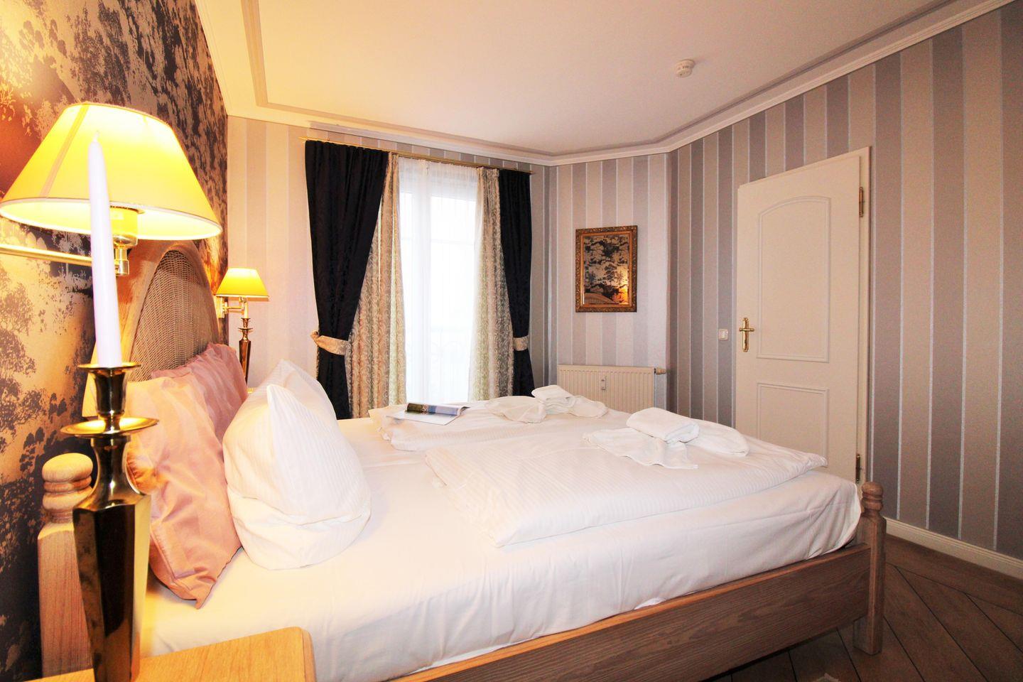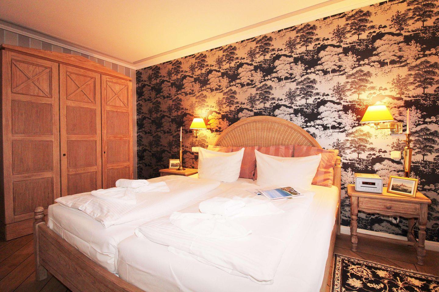 Das gemütliche Schlafzimmer ist mit einem bequemen Doppelbett, Nachttischen, einem geräumigen Kleiderschrank sowie einem Radiogerät (mit CD-Player) eingerichtet.