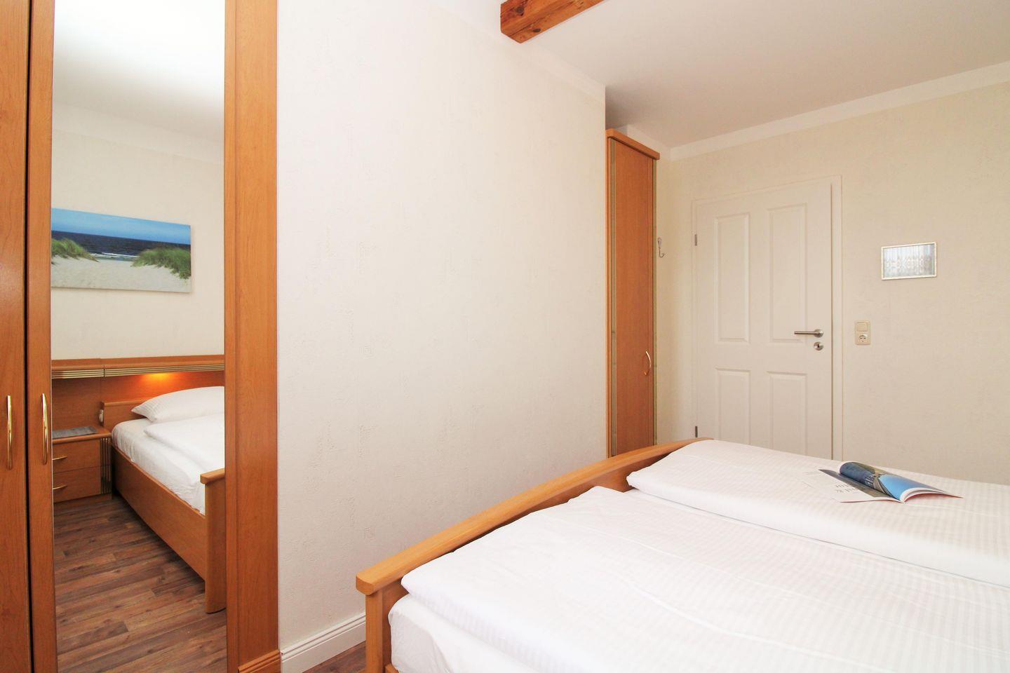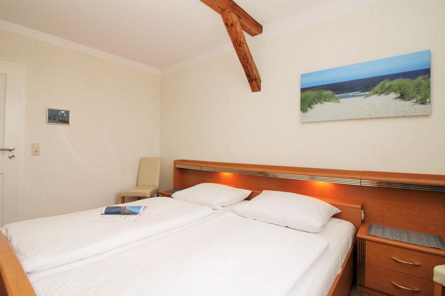 Das geräumige 1. Schlafzimmer ist mit einem bequemen Doppelbett, Nachttischen, 2 Kleiderschränken sowie 2 Stühlen eingerichtet.