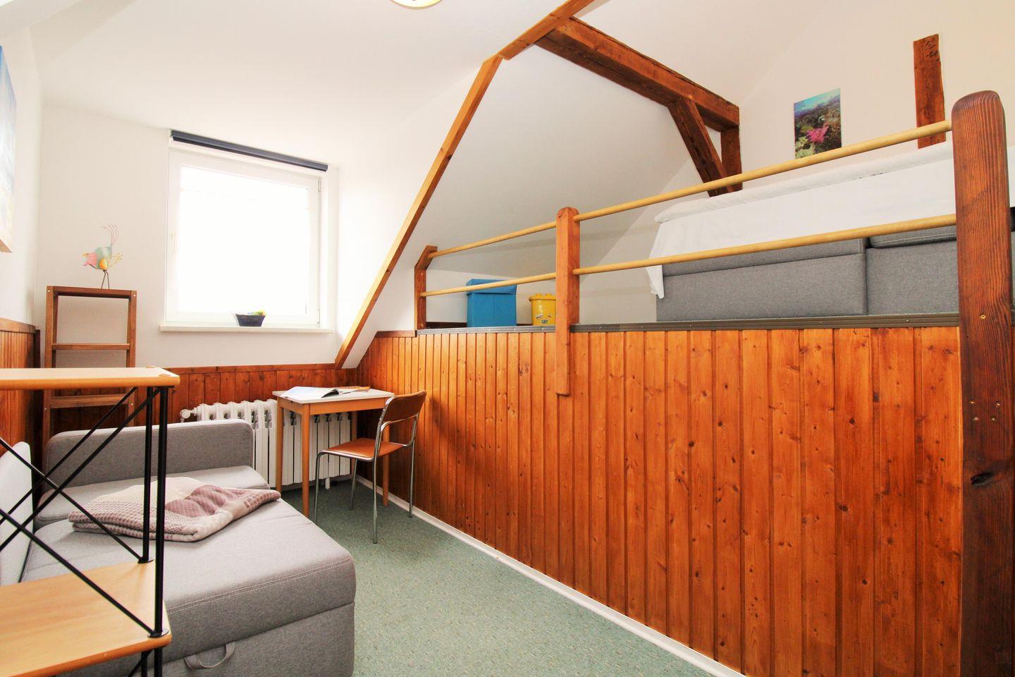 Das separate und zusätzliche 2. Schlafzimmer (Kinderzimmer) verfügt über 2 getrennt stehende Einzelbetten (Schlafcouchen), einen kleinen Tisch mit Stuhl sowie verschiedene Regale.