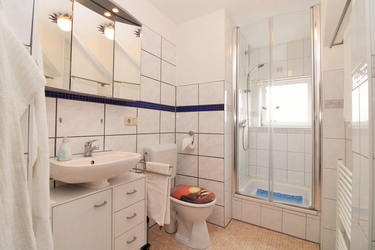 Das helle Badezimmer (mit Tageslicht / Fenster) verfügt über eine Dusche, ein Waschbecken mit Unterschrank, einen Spiegelschrank, einen Handtuchheizkörper sowie ein WC.