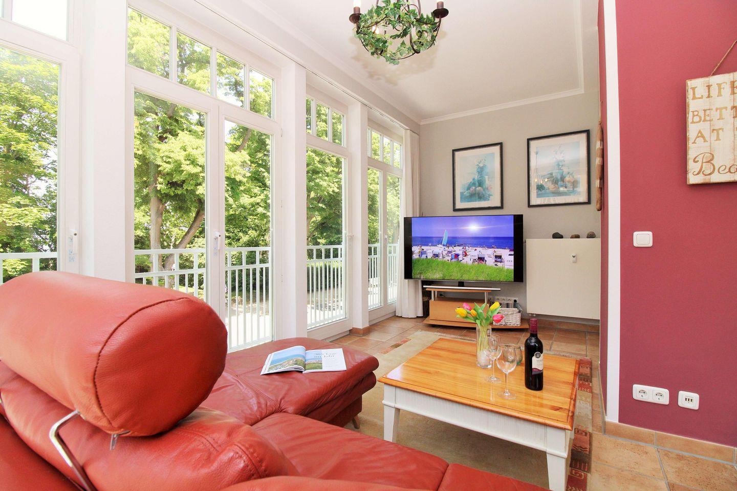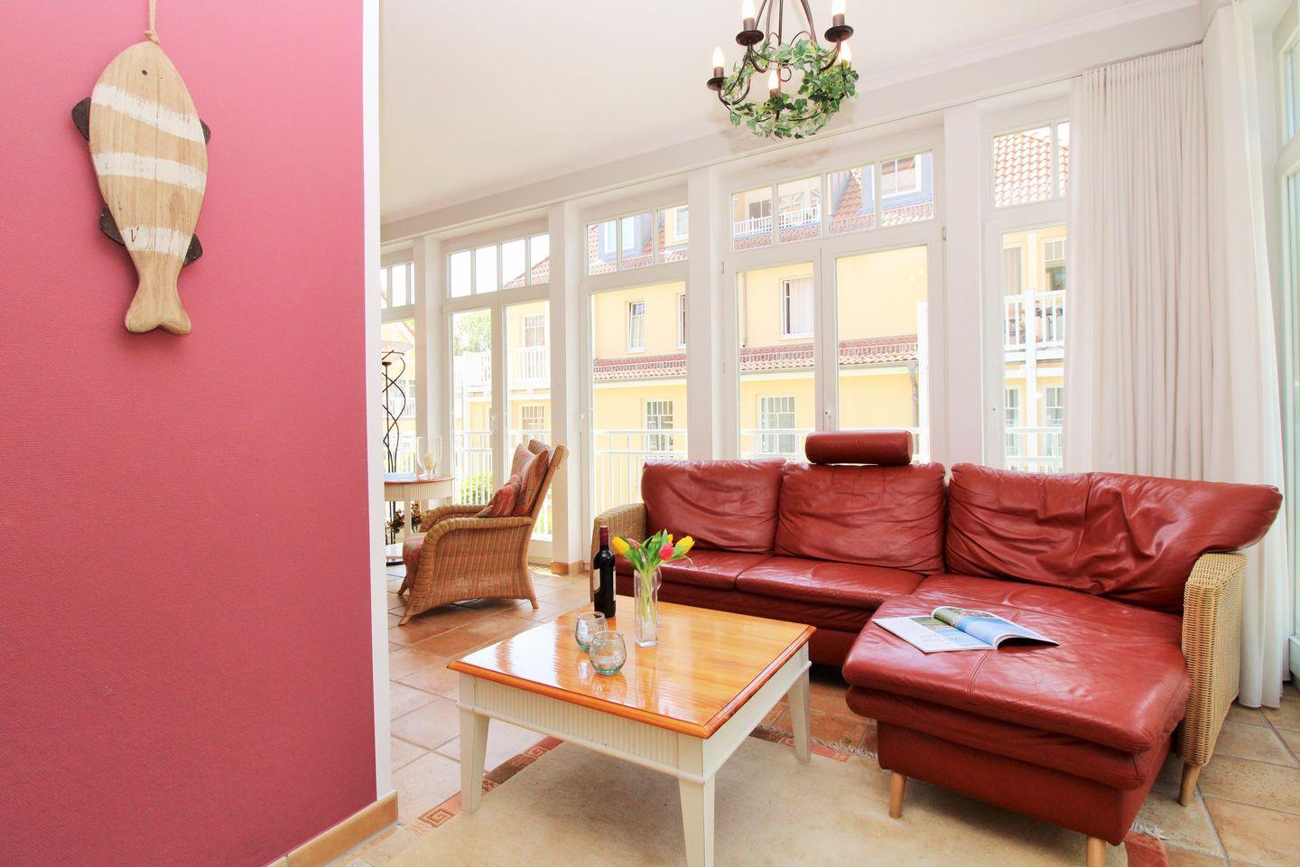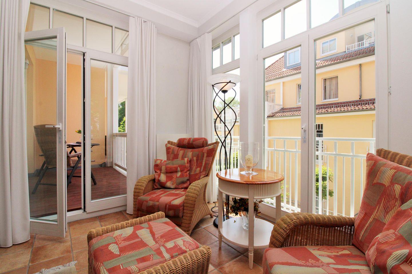 Das geräumige, lichtdurchflutete und sehr geschmackvoll eingerichtete Wohn-/Esszimmer mit großen bodentiefen Fenstern im gesamten Raum sowie herrlichem direktem Meerblick verfügt über eine Sitzgruppe mit bequemer Couch, Sesseln, Hocker und Couchtisch, eine separate Essecke mit Esstisch und 6 Stühlen sowie verschiedene Schränke und Sideboards. Vom Wohnzimmer aus haben Sie direkten Zugang zu dem ca. 5 m² großen und teilweise überdachten Balkon (nach Westen ausgerichtet) mit Balkonmöbeln - hier sitzen Sie entspannt und genießen den seitlichen schönen Blick auf die Strandpromenade und die Ostsee!
