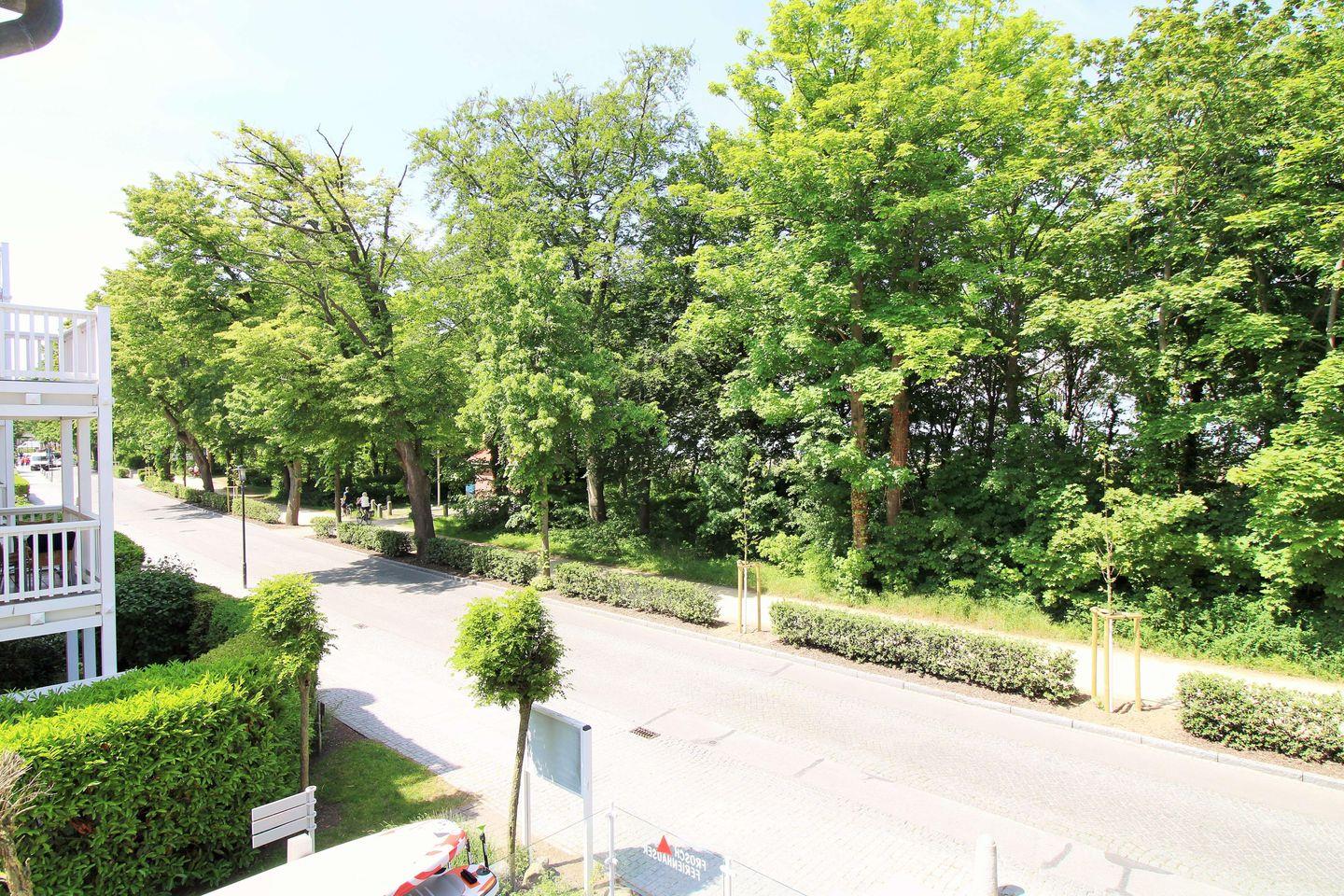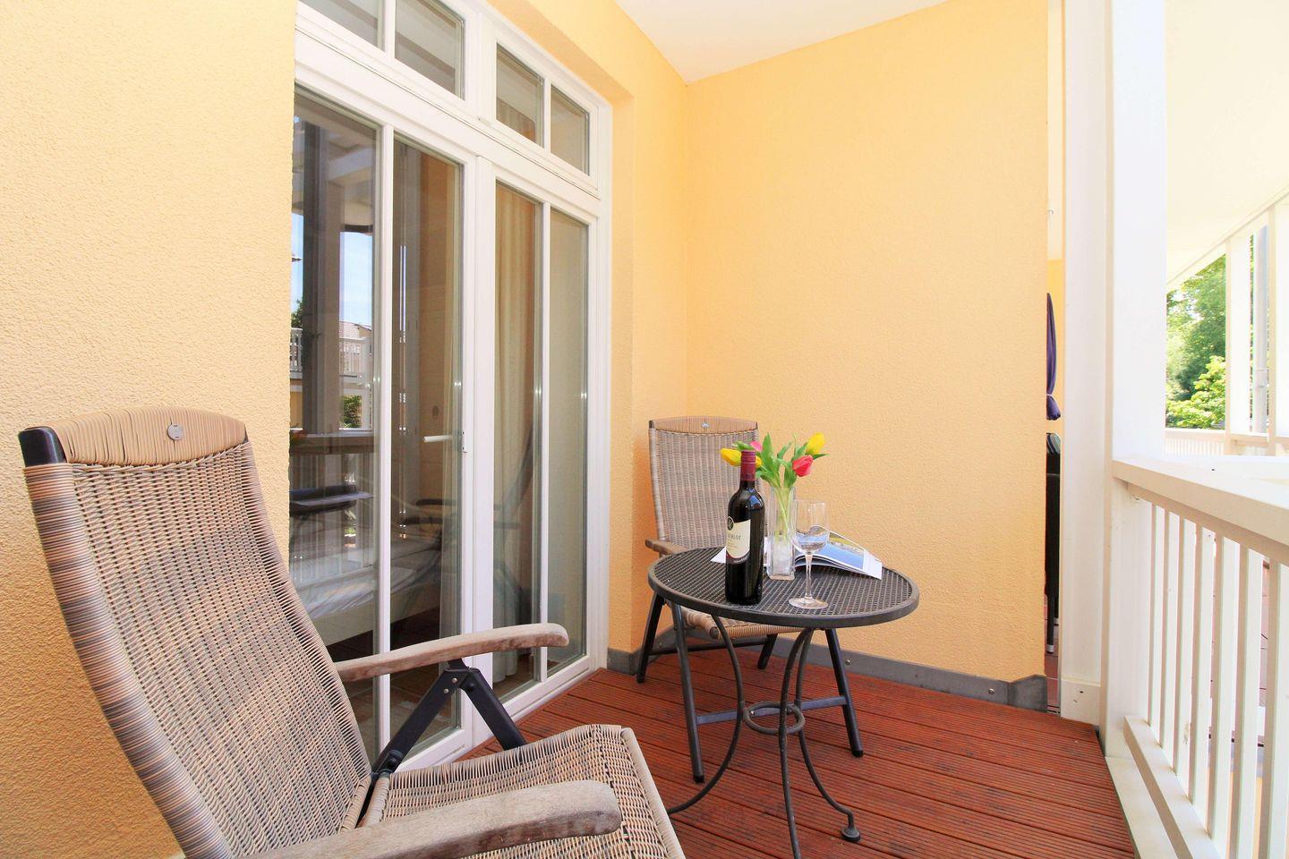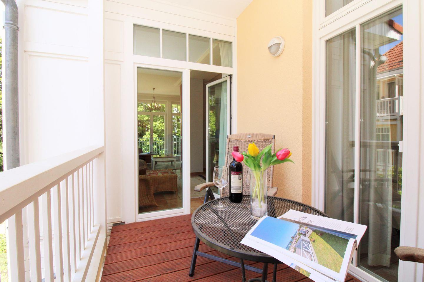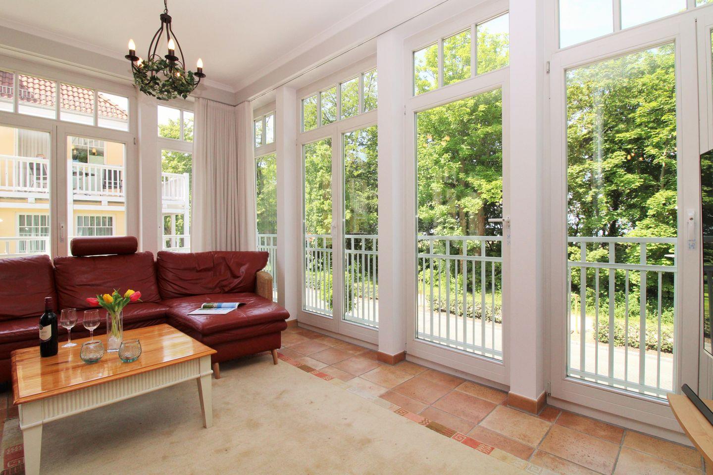 Das geräumige, lichtdurchflutete und sehr geschmackvoll eingerichtete Wohn-/Esszimmer mit großen bodentiefen Fenstern im gesamten Raum sowie herrlichem direktem Meerblick verfügt über eine Sitzgruppe mit bequemer Couch, Sesseln, Hocker und Couchtisch, eine separate Essecke mit Esstisch und 6 Stühlen sowie verschiedene Schränke und Sideboards. Vom Wohnzimmer aus haben Sie direkten Zugang zu dem ca. 5 m² großen und teilweise überdachten Balkon (nach Westen ausgerichtet) mit Balkonmöbeln - hier sitzen Sie entspannt und genießen den seitlichen schönen Blick auf die Strandpromenade und die Ostsee!